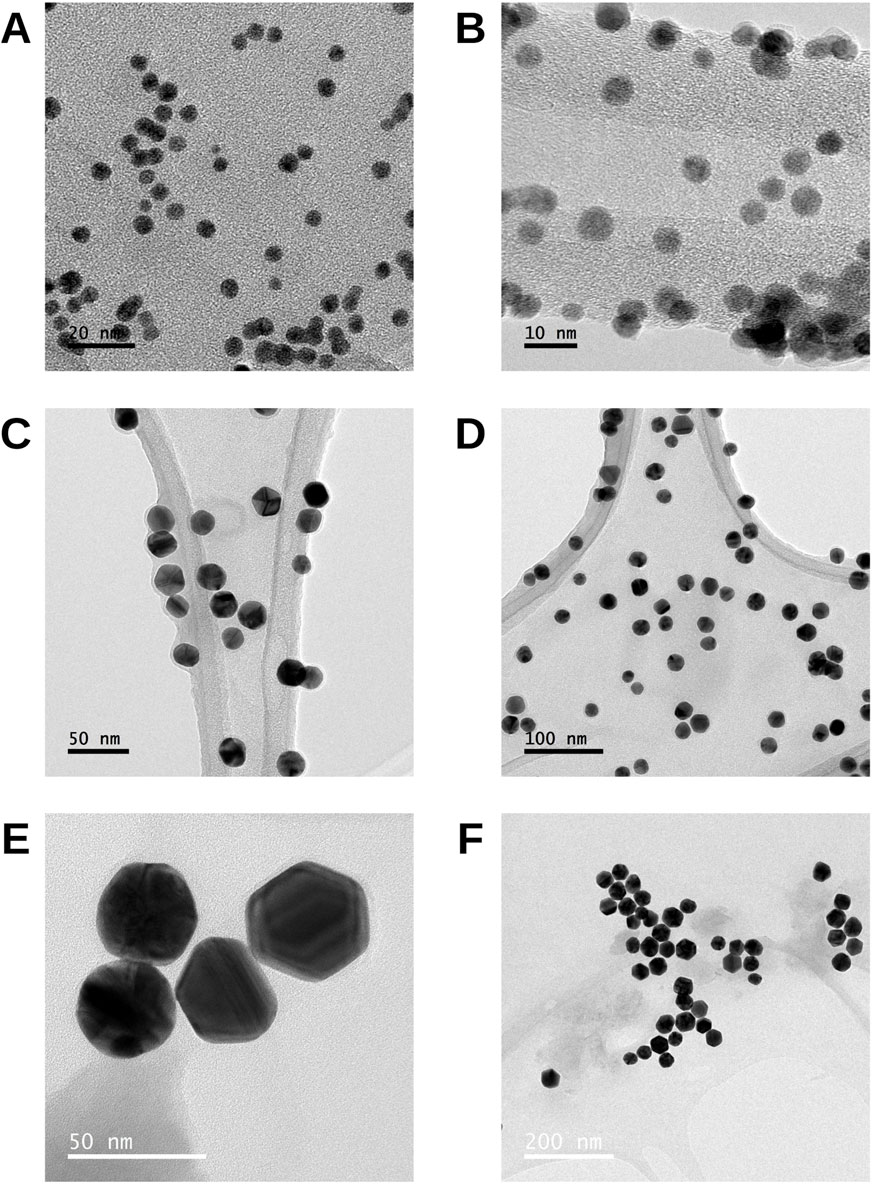 Figure 1. TEM images of AuNPs of different sizes. (A,B) 5 nm, (C,D) 20 nm, and (E,F) 40 nm particles. Representative micrographs illustrate the morphology and distribution of the nanoparticles at each nominal size.