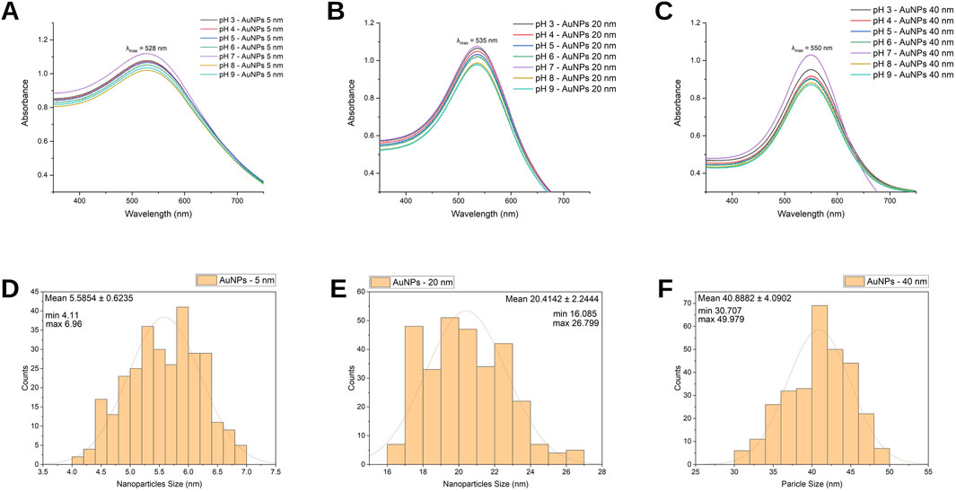 Figure 2. Characterization of AuNPs. UV-Vis spectra of (A) 5 nm, (B) 20 nm, and (C) 40 nm AuNPs at different pH values, showing the corresponding surface plasmon resonance peaks. Size distribution histogram for (D) 5 nm, (E) 20 nm, and (F) 40 nm AuNPs obtained from TEM measurements.