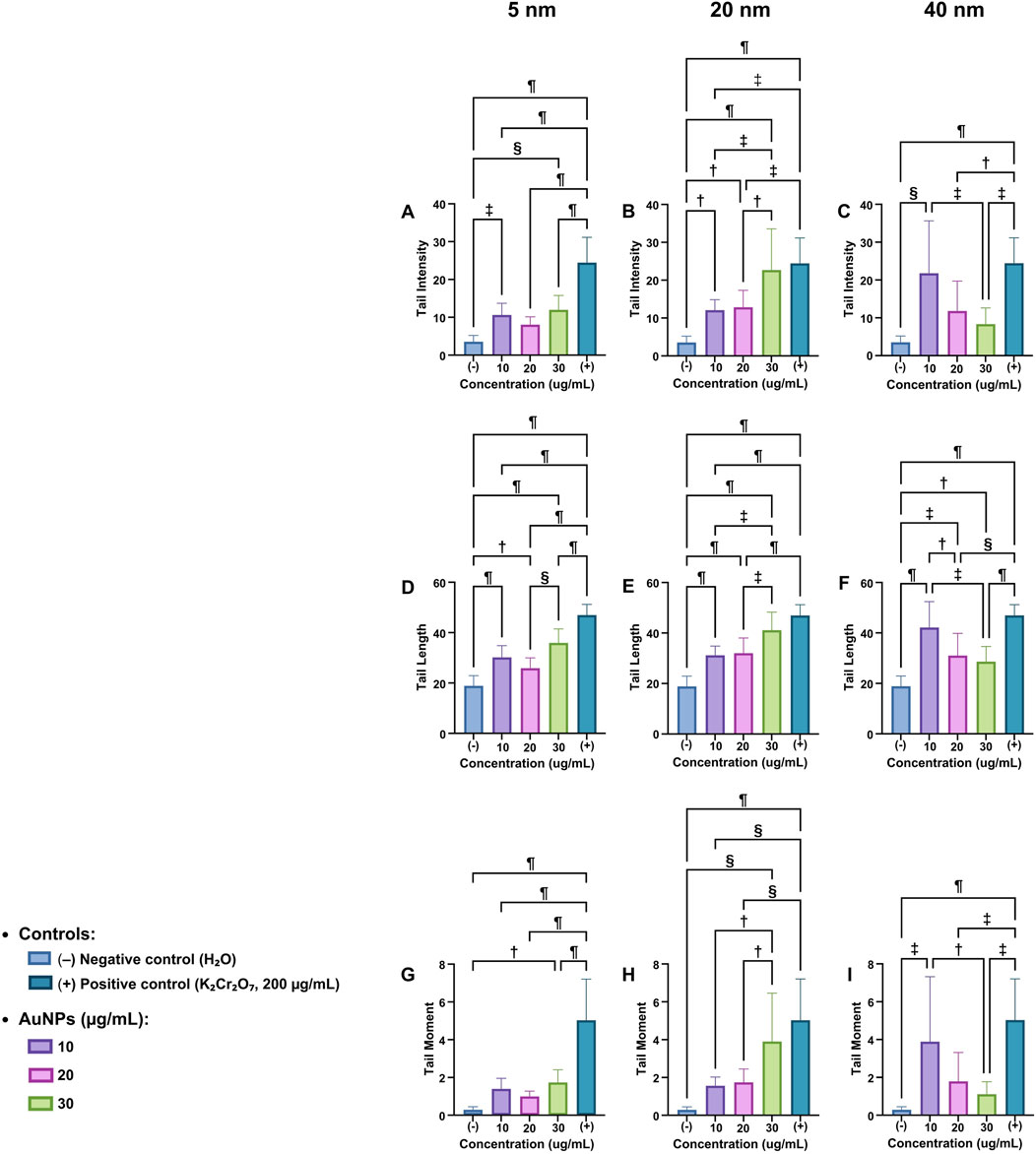 Figure 3. Comet Assay parameters in Vicia faba root cells exposed to AuNPs. Tail intensity (A–C), tail length (D–F), and tail moment (G–I) were evaluated for 5, 20, and 40 nm AuNPs at different concentrations (10, 20, and 30 μg/mL). Negative control: H2O; positive control K2Cr2O7 (200 μg/mL). Data are presented as mean ± SD. Statistical significance: