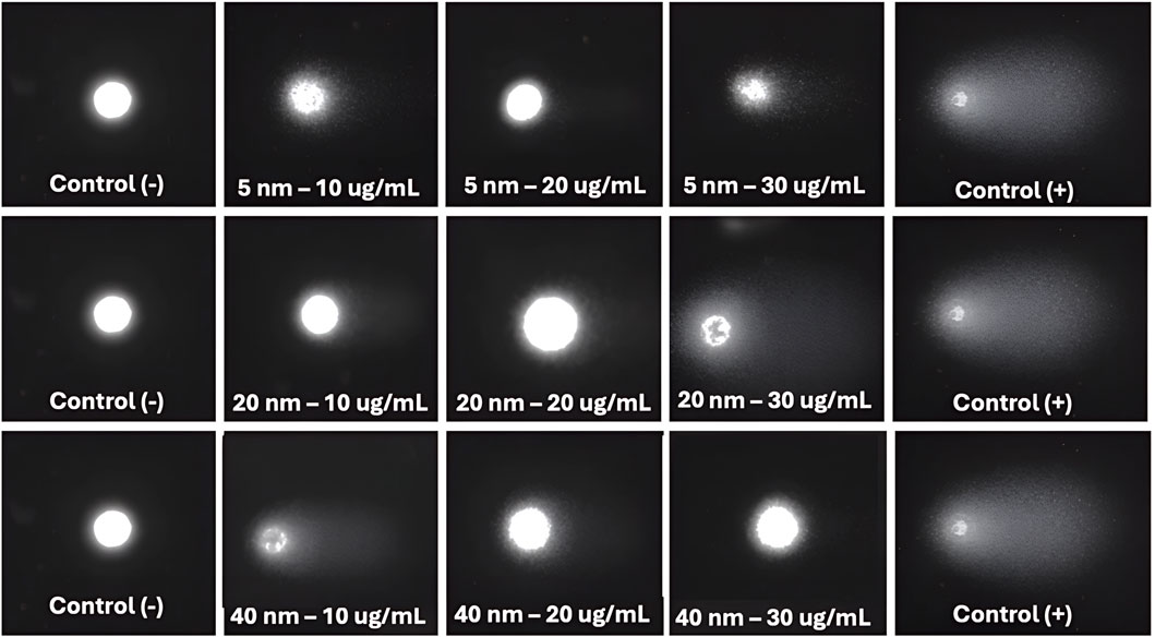 At 40 nm, the behavior is different. At 10 μg/mL, genotoxic damage is moderate, but at higher concentrations (20 and 30 μg/mL), a decrease in the length and intensity of the tail is observed, indicating less genotoxic damage. On the other hand, the positive control (K2Cr2O7, 200 μg/mL) shows extensive and intense tails in all images, reflecting severe genotoxic damage.