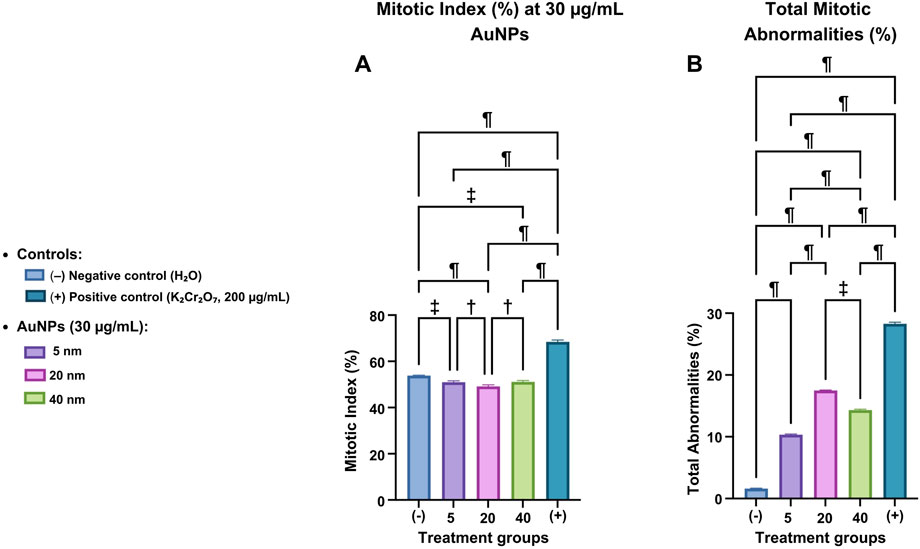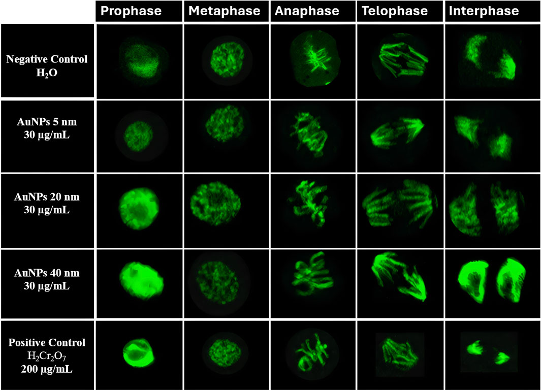 Experimental treatments included AuNPs of three sizes (5, 20, and 40 nm) at three concentrations per size (10, 20, and 30 μg/mL), for nine total conditions. Each condition was tested in triplicate with a 1-h exposure. After treatment, the roots used for mitotic index and chromosomal abnormality analysis were placed in resting conditions for 24 h of recovery.