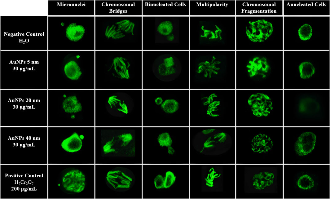 Vicia faba seeds were used, previously washed, disinfected, and germinated according to the protocol described in the previous section. The roots were exposed to AuNPs of three different sizes (5, 20, and 40 nm) at a concentration of 30 μg/mL. After the exposure period concluded, the roots were gently rinsed with deionized water and placed on a layer of damp cotton for 24 h to facilitate recovery. After this time, approximately 2 cm was cut from the apical region of each root and placed on a concave slide, where they were treated with 5N HCl for 8 min to facilitate cell disaggregation. Subsequently, the acid residues were removed, and two drops of Hoechst 33342 were added at a concentration of 10 mg/mL.