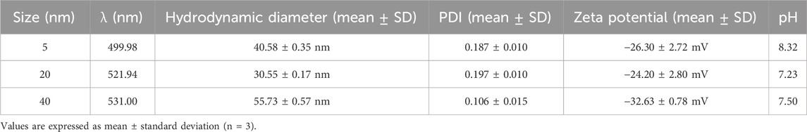 The zeta potential (ζ-potential) values were −26.30 ± 2.72 mV (5 nm), −24.20 ± 2.80 mV (20 nm), and −32.63 ± 0.78 mV (40 nm), confirming suitable colloidal stability since values with |ζ| ≥ 25 mV are generally considered acceptable. The pH values of the suspensions were 8.32, 7.23, and 7.50 for 5, 20, and 40 nm AuNPs, respectively, remaining within a physiologically stable range. Together, these findings confirm the stable colloidal properties of the AuNPs under the tested conditions (Bhattacharya et al., 2022; Gharibkandi et al., 2023; Maguire et al., 2018).