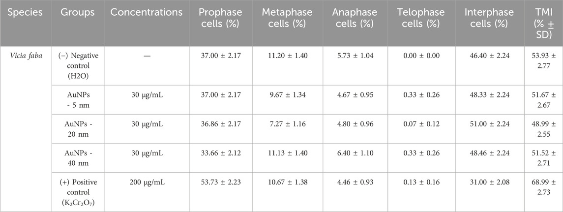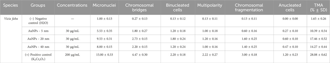 The V. faba beans is cultivated in over 70 countries, covering approximately 2.2 million hectares and yielding nearly 4 million tons annually (Warsame et al., 2018). This seed is commonly used for genotoxicity, mutagenicity, and cytotoxicity tests (Alavi et al., 2023; Drzymała and Kalka, 2024; Li et al., 2023; Lu et al., 2021; Madnay et al., 2022; Yang et al., 2022; Onisan et al., 2025). The NP market, especially for AuNPs, has expanded. These NPs exist in various environments, but their impact is understudied. In this study, we evaluated their genotoxicity and mutagenicity using the comet assay, mitotic index percentage, and chromosomal aberration analysis. This enabled the assessment of the effects of AuNPs on genetic material.
