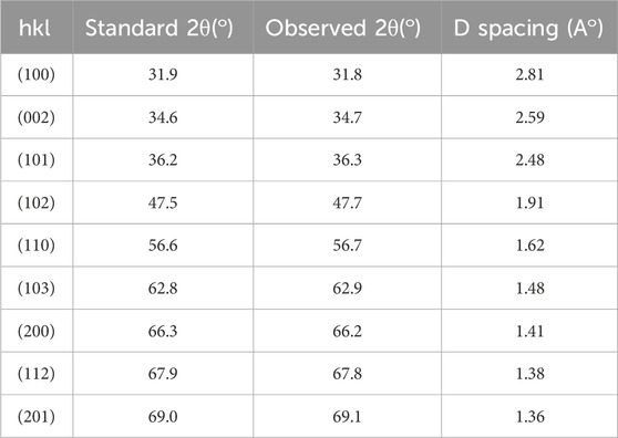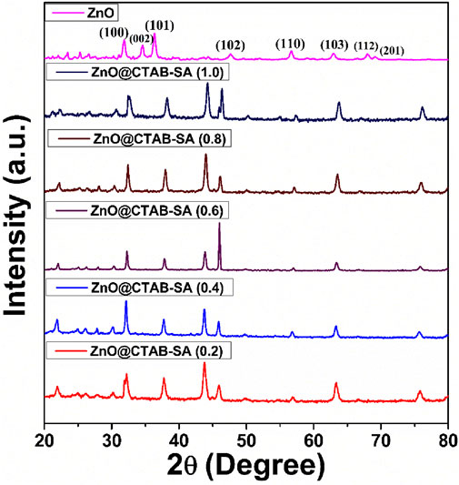 The PXRD pattern of the synthesized ZnO@CTAB-SA nanocomposites (Figure 2) exhibits characteristic diffraction peaks at 22.3°, 26.6°, 30.76°, and higher intensity peaks at 32.59°, 38.29°, 44.27°, 46°, and 50.26° on these peaks 32.59°, 38.29°, 44.27°, 46°, and 50.26°, which can be indexed to the (100), (002), (101), (102), and (110) planes these are stimulated with (JCPDS card no. 36-1,451) (Supramaniam et al., 2021). A comparison of standard and observed diffraction data is summarized in Table 2. Minor peak shifts and a decrease in relative intensity were observed in the composites, which may be attributed to lattice strain and the interaction between ZnO nanoparticles and the sodium alginate-CTAB polymer matrix. Additional peaks at lower angles (22.3°, 26.6°, 30.76°) are attributed to the polymeric components (Sodium alginate and CTAB) and possible amorphous organic residues. Similar features have been reported in polymer-based nanocomposites containing ZnO NPs (Li et al., 2018). Significant variations in peak intensities, such as the notably strong peak near 47o observed in ZnO@CTAB-SA (0.6) compared to the prevalent intensity near 44° in other samples, are attributed to differences in nanoparticle size distribution, morphology, and preferential orientation within the polymer matrix. These peaks do not correspond to ZnO or any impurity phases. The slight shifts and intensity variations of ZnO peaks are due to strain and strong interfacial interactions in the composite, typical of such systems. No other crystalline phases were detected, confirming the retained purity of the ZnO wurtzite structure in the composites.