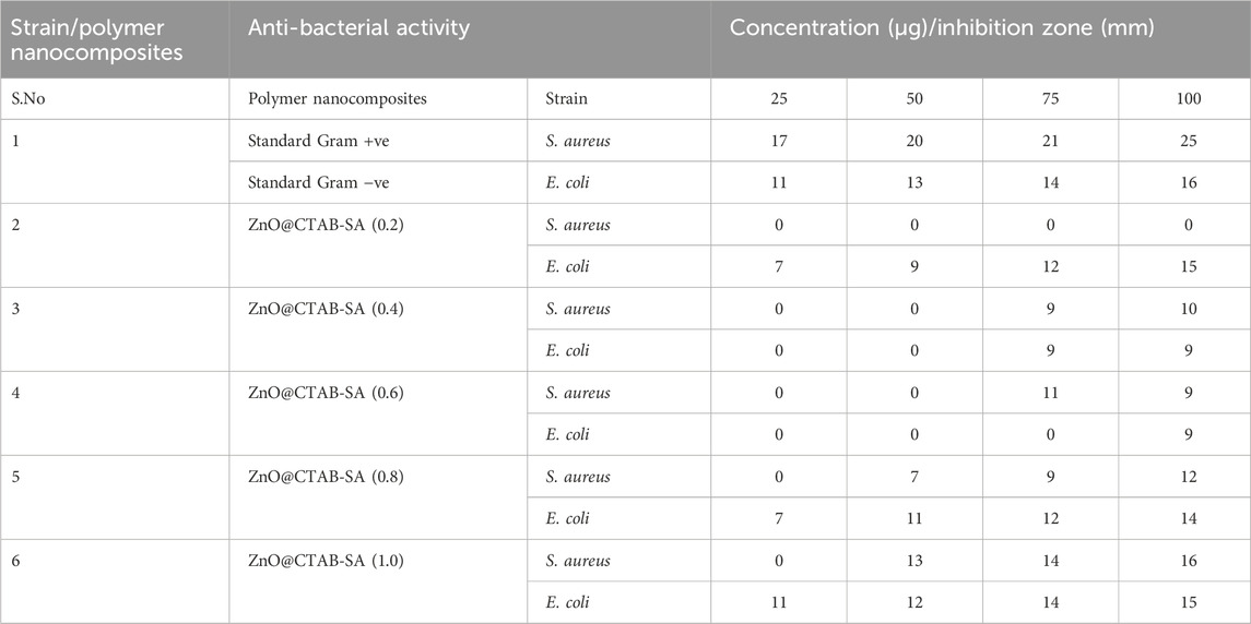 The antibacterial efficacy of ZnO@CTAB-SA composites was evaluated against Staphylococcus aureus (Gram-positive) and E. coli (Gram-negative), and compared with a standard antibacterial agent observed in Table 1. Figures 5a, 7 a illustrates that the standard exhibited strong and consistent antibacterial activity, with inhibition zones ranging from 17 to 25 nm for S. aureus and 11–16 mm for E. coli. Among the composites, ZnO@CTAB-SA (0.2) exhibited minimal activity against S. aureus while demonstrating modest activity against E. coli, reaching a maximal inhibition zone of 15 mm at a concentration of 100 μg/mL (Figure 5b). ZnO@CTAB-SA (0.4) and ZnO@CTAB-SA (0.6) demonstrated concentrations, resulting in inhibition zones of 10 mm and 11 mm for S. aureus respectively (Figures 5c,d). ZnO@CTAB-SA (0.8) demonstrated enhanced effectiveness against both bacterial strains, achieving inhibition zones of 12 mm for S. aureus and 14 mm for E. coli at a concentration of 100 μg/mL (Figure 5e). ZnO@CTAB-SA (1.0) exhibited the highest antibacterial activity among the composites, showing inhibition zones of 16 mm for S. aureus and 15 mm for E. coli at a concentration of 100 μg/mL (Figure 5e), which is comparable to the standard this may be due to the higher zinc concentration in the composites enhances the reactive oxygen species, damaging bacterial membranes and intracellular components and its increases zinc ions reduce bacterial enzymatic activity and growth and it's functionalizing the surface of the composite increases its binding affinity to bacterial cell walls, especially Gram-positive S. aureus having thick peptidoglycan barrier. This composite is the most efficient antibacterial composite and microbial control.