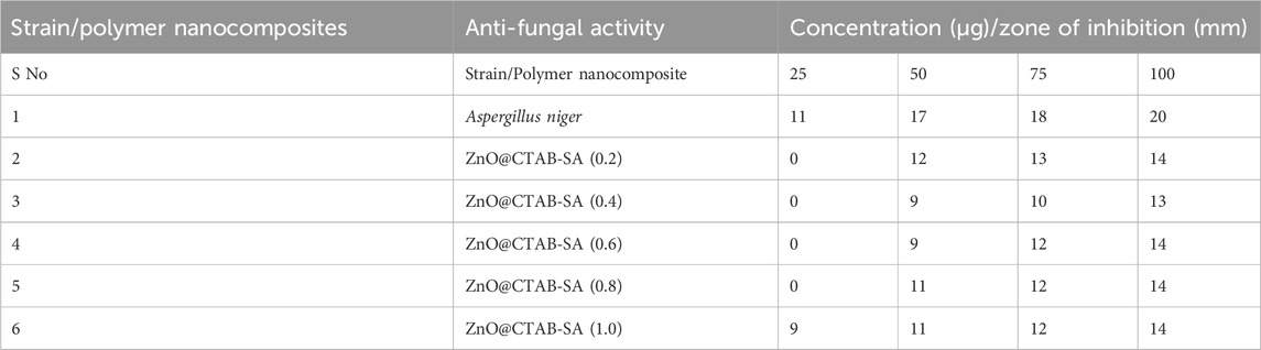 The antifungal efficacy of ZnO@CTAB-SA composites at varying concentrations (0.2, 0.4, 0.6, 0.8, and 1.0) was assessed against Aspergillus niger and compared with a standard antifungal drug (Figures 6a, 7b). The results showed a notable dose-dependent antifungal effect, with inhibition zones ranging from 11 mm at 25 μg to 20 mm at 100 µg. Among the composites, ZnO@CTAB-SA (0.2) (Figure 6b) demonstrated slight activity, with inhibitory zones starting at 12 mm at 50 µg and rising to 14 mm at 100 µg. ZnO@CTAB-SA (0.4) and (0.6) (Figure 6) displayed similar patterns, with maximum inhibition zones of 13 mm and 14 mm, respectively, at a concentration of 100 µg. ZnO@CTAB-SA (0.8) (Figure 6) demonstrated slightly improved activity, showing inhibition zones of 11 mm, and 14 mm at a concentration of 50,100 µg. ZnO@CTAB-SA (1.0) (Figure 6) exhibits exceptional performance among the composites, exhibiting a 9 mm, and 14 mm, inhibitory zone at the minimum concentration of 25 μg, which expanded to 14 mm at 100 µg. Although all composites demonstrated significant antifungal activity, none surpassed the effectiveness of the standard, indicating a potential for future enhancement of the ZnO@CTAB-SA composite formulation.