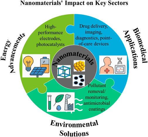 Scalability, reproducibility, long-term stability, and safety evaluation are some of the issues that still need to be resolved as the area develops in order to convert laboratory progress into commercially viable goods (Khatoon et al., 2023). Moreover, affordability is the key to ensuring equitable access to nanomaterial-based devices across both developed and developing regions. This Research Topic brings together research and perspectives highlighting innovations in nanomaterials that are not only cutting-edge but also designed with affordability and sustainability in mind. Our goal is to demonstrate how nanomaterials may revolutionise energy technologies, environmental monitoring, and biomedical devices in ways that are significant, affordable, and applicable worldwide by connecting fundamental research with real-world applications. Our goal is to demonstrate how nanomaterials may revolutionize energy technologies, environmental monitoring, and biomedical devices in ways that are significant, affordable, and applicable worldwide by connecting fundamental research with real-world applications (Figure 1).