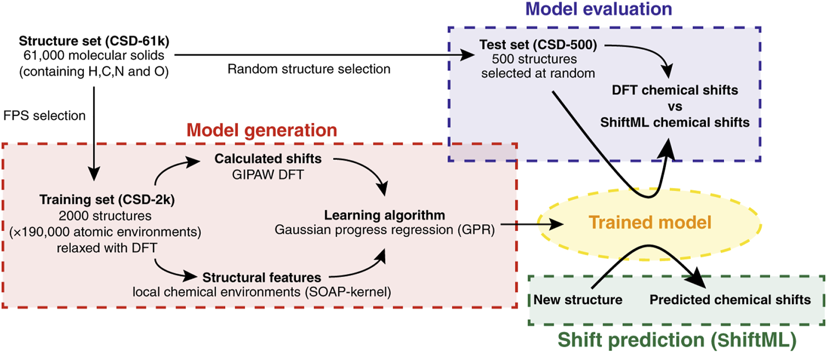 Paruzzo et al. (2018) Solid-state NMR is a powerful tool for analyzing powdered and amorphous solids at the atomic level, with great utility in pharmaceutical sciences. The discipline has been revolutionized by the advent of quantum methods to calculate chemical shifts with high accuracy. Chemical shift-based NMR crystallography has therefore become a popular strategy to identify polymorphs, and also for de novo determination of crystal structures from powders (Facelli and Grant, 1993). This has been enabled by plane wave DFT methods developed for periodic systems based on gauge, including projected augmented wave (GIPAW), which provides good accuracy to emulate the local atomic environments (Blöchl, 1994). However, computational cost is again prohibitive for large systems and/or for higher levels of theory. In this seminal work, Paruzzo and co-workers developed a local environment-ML based method to predict chemical shifts of molecular solids with an accuracy comparable to DFT (Paruzzo et al., 2018). Due to limitations in experimental databases for NMR of solids, the authors decided to train and validate their ML using GIPAW DFT-calculated chemical shifts of a wide variety of structures taken from the Cambridge Structural Database (CSD) (Groom et al., 2016). Bypassing the experimental information has several advantages, which include avoiding biased or incorrectly reported data, as well as offering an unlimited number of virtual structures. In fact, this interesting practical idea has been replicated by other subsequent studies, as detailed below. From an initial database of 61,000 structures, the authors selected 2,000 diverse molecules for training, and 500 for validation. The first subset was selected using the farthest point sampling algorithm (FPS), and the second one randomly. The NMR properties of the resulting structures were calculated at the GIPAW DFT level, the local environments being based on the smooth overlap of atomic positions (SOAP) kernel (Bartók et al., 2013; De et al., 2016). This approach is based on encoding the atomic environment by a 3D neighborhood density defined by a superimposition of Gaussians, one centered at each atom located within a spherical boundary from the core atom. The ML was trained using the Gaussian process regression (GPR) framework, which previously performed well when coupled with SOAP (Figure 2). (Bartók et al., 2022) Once trained, ShiftML was highly accurate, particularly for 1H (MAE 0.49 ppm). The other nuclei showed larger errors relative to DFT (4.3 ppm for 13C, 13.3 ppm for 15N, and 17.7 ppm for 17O). According to the authors, this was due to the significantly fewer training environments for heteronuclei than for 1H. However, the reduction in computational cost is remarkable (less than 1 min vs. 62–150 CPU hours), demonstrating its amazing predictive ability in short periods of time.