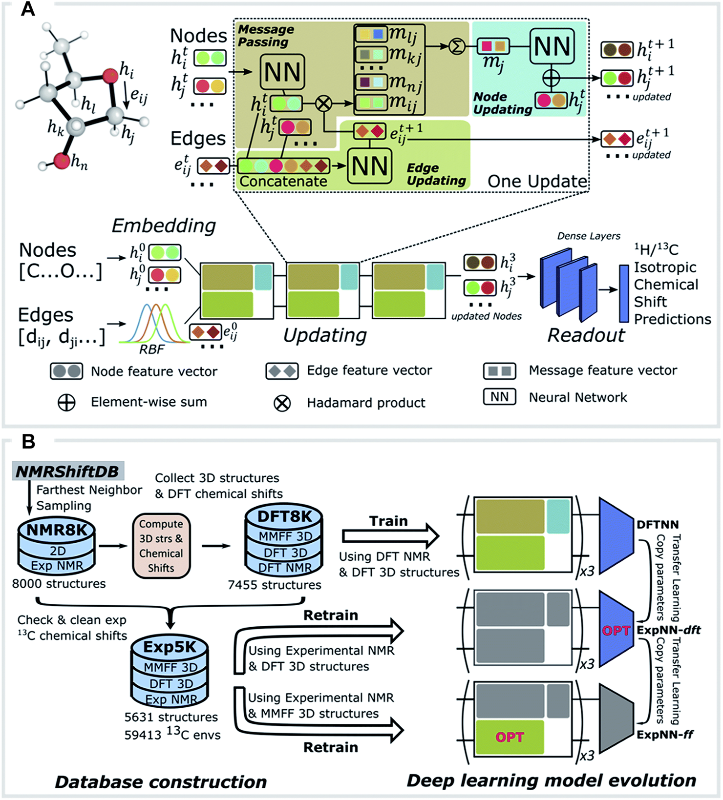 Guan et al. (2021) Paton’s group developed a ML model to tackle the usual difficulties in predicting 1H and 13C chemical shifts, namely: computation time demand and reaching the required accuracy to select the correct structure from among several candidates. For this purpose, a huge amount of experimental data is necessary, but are not always easily accessible, complete, well assigned or parseable. Therefore, to surpass these problems the authors decided to use their own dataset obtained from DFT calculations to train a neural network (NN). However, such an approach is restricted by the DFT methodology used (basis set and solvation model, among others). Therefore, to solve these limitations, they used a Transfer Learning (TL) approach (Taylor and Stone, 2009). In that direction, they developed three GNN models (St. John et al., 2019), namely: DFTNN, ExpNN-dft and ExpNN-ff. Software architectures and hyper-parameters are identical for all of these, but they were developed using different input structures (Figures 3A,B). DFTNN used a vast array of structurally diverse organic molecules from the DFT8K dataset. Their NMR chemical shifts were calculated at the mPW1PW91/6-311+G(d,p) level of theory, implementing optimized geometries at the M06-2X/def2-TZVP level, which were subsequently used to train the GNN (1H and 13C separately). However, a weak point of this first approach was that the neural network was only trained against DFT-calculated data. To face this problem, the authors used TL to retrain the DFTNN model against experimental NMR data from the Exp5K dataset, creating a new model named ExpNN-dft. However, this model also needed structure optimization that caused a performance bottleneck. The authors’ final answer was the ExpNN-ff model, where ExpNN-dft was retrained replacing the starting geometries with those directly obtained from molecular mechanics conformational searches using the MMFF94 force field. This replacement drastically reduced CPU time. The ExpNN-ff model was tested with good results in three different applications: i) structure elucidation by comparison between predicted and experimental NMR data, ii) NMR data reassignment and iii) forecast of regioselectivity of electrophilic aromatic substitution sites using simulated NMR data as descriptors. Moreover, the model differentiated between stereoisomers and even showed distinct predictions for different conformations of the same molecule. Differences between GNN predicted NMR chemical shifts and those obtained from DFT calculations resulted in mean average errors (MAE) of 1.26 ppm for 13C and 0.16 ppm for 1H. Importantly, ExpNN-ff showed a comparable accuracy to normal DFT calculations but with a 6000-fold reduction in CPU time. Therefore, this model can perform NMR data predictions for large flexible structures that are unfeasible for DFT calculations (Daranas and Sarotti, 2021). According to the authors, there is still room for improvement in its results. Their main concern is regarding dependency of the outcome on the quality of the input candidate 3D structures obtained in the molecular mechanics conformational search step. Recent work on this issue confirms the importance of this stage (Cuadrado et al., 2022). Thus, the authors suggest the use of semi-empirical structures as an alternative. It is worth noting that they make this analysis tool easily available in a webpage (http://nova.chem.colostate.edu/cascade/) to perform chemical shift predictions.