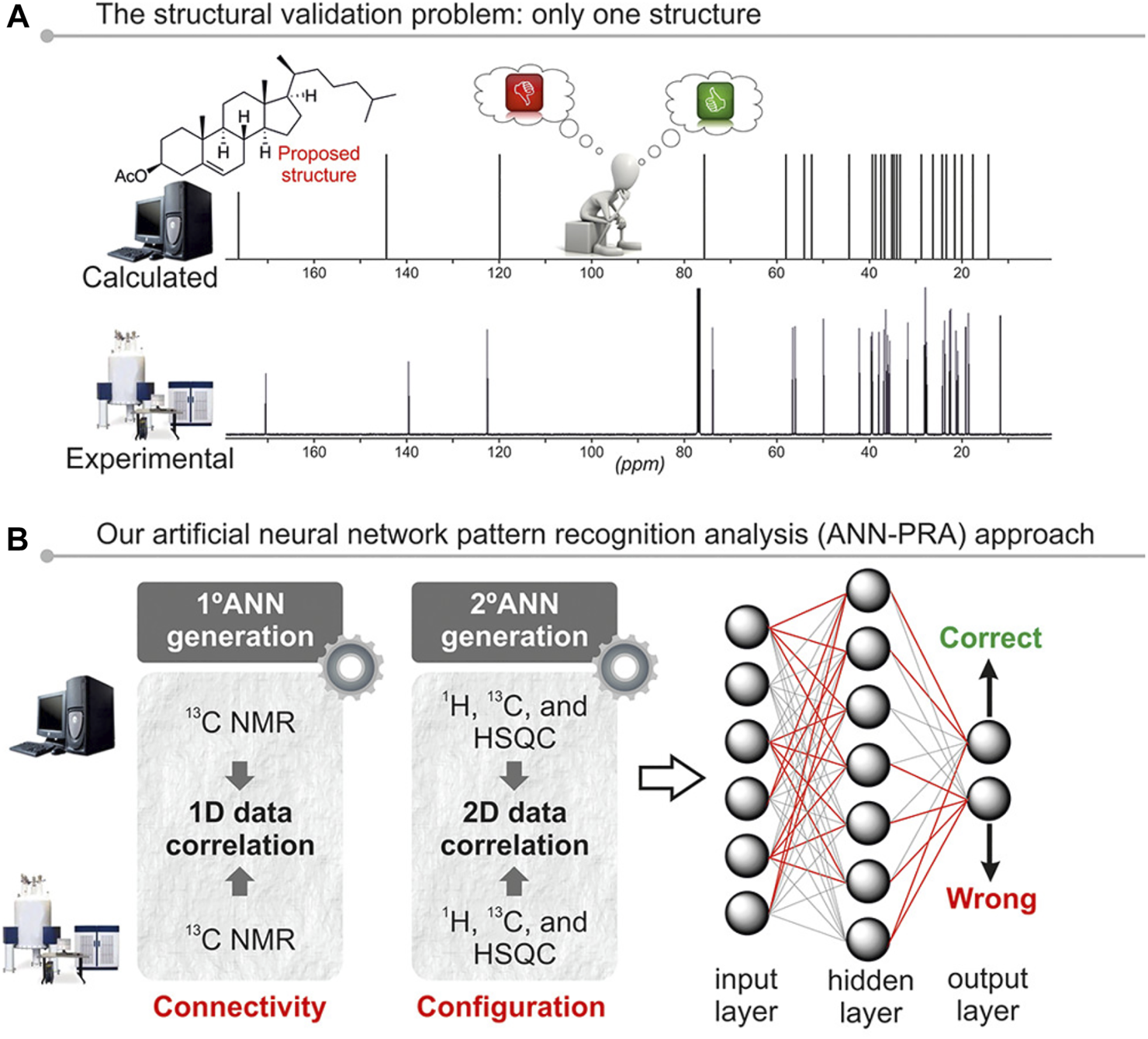 Sarotti (2013), Zanardi and Sarotti, 2015) These methods were developed by Sarotti´s group to tackle the structural validation problem. That is, to decide the correctness of structural proposals based on the correlation of the experimental NMR data collected for a given molecule and the theoretical chemical shifts calculated for it. By that time, the leading strategy in DFT-based structural elucidation was based on a direct comparison between potential candidates (for example, CP3 or DP4) (Smith and Goodman, 2009; Smith and Goodman, 2010). Regardless of the performance of each method, the underlying hypothesis assumes that the correct structure is included within the candidate set. The approach followed to determine a potential structural misassignment using one set of experimental and calculated data was based on the use of pattern recognition analysis (PRA), with the aid of artificial neural networks (ANNs). The latter are mathematical models in which interconnected artificial neurons emulate the function of a biological brain able to learn from the data. The proof-of-concept was based on monodimensional 13C NMR data correlation with the aid of two-layer feed-forward ANNs, using a test set of 200 structures. Different descriptors were assessed as reference standards, including R2, MAE, maximum error (MaxErr), each computed using TMS and MSTD (multi-standard approach) (Sarotti and Pellegrinet, 2009; Sarotti and Pellegrinet, 2012). A large number of ANNs featuring different numbers of input and hidden layers were built and trained, then those with optimal classification ability were kept for validation using a set of 26 natural products originally misassigned, with their respective revised structures. This first generation of ANNs performed excellently in identifying connectivity mistakes (such as constitutional isomerism), though they were not conceived to tackle subtler differences like stereoisomerism (Sarotti, 2013). This motivated development of a new generation of ANNs by merging mono-dimensional 1H and 13C NMR data with 2D HSQC correlations (Figures 5A,B). Hundreds of different ANNs were trained using the standard correlation parameters described above, as well as 18 new descriptors accounting for the global correlation between experimental and simulated HSQC data. The training set was composed of 200 structures (100 correct and 100 artificially-made incorrect ones). The most efficient ANNs were validated using a set of 32 originally misassigned natural products, along with their revised structures. The performance achieved was noteworthy, identifying subtle structural errors in an efficient and simple manner (Zanardi and Sarotti, 2015).