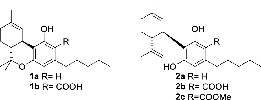 An acidic form of phytocannabinoids is produced in cannabis (Cannabis sativa L.) in accordance with their derivation from the aldol-type aromatization of an acidic polycarbonyl linear precursor (Hanuš et al., 2016). This seminal discovery was reported more than 50 years after the purification of cannabinol, the first phytocannabinoid to be obtained in pure form, thus testifying to the combination of technical and legal difficulties that have plagued phytocannabinoid research (Appendino, 2020). The presence of the ortho- and para-electron-releasing oxygen functions makes the native form of acidic phytocannabinoids prone to decarboxylation (Pollastro et al., 2017), a process slow at room temperature but dramatically accelerated by heating (Filer, 2022). In the early stages of bioactivity studies on phytocannabinoids, attention was largely focused on Δ9-tetrahydrocannabinol (Δ9-THC, 1a) and compounds that shared its biological profile; the other phytocannabinoids were ignored. Since acidic cannabinoids are non-psychotropic and inactive in the tetrad test (Hanuš et al., 2016), their study was long neglected and only started in the wake of the demonstration of the clinical potential of cannabidiol (CBD, 2a), the archetypal non-narcotic phytocannabinoid (Hanuš et al., 2016). Remarkable differences were evidenced between the biological profile of the neutral and the acidic forms of Δ9-THC (Δ9-THCA-A, 1b) and of CBD (CBDA, 2b), with significant changes in terms of orthosteric and allosteric interaction with CB1R and increased emphasis on the modulation of peroxisome proliferator-activated receptor-γ (PPARγ), GPR55 receptor, and ion channel-like transient receptor potential cation channel subfamily V member 1 (TRPV-1) [5]. Conversely, the interaction with CB2R was largely retained (Caprioglio et al., 2022).