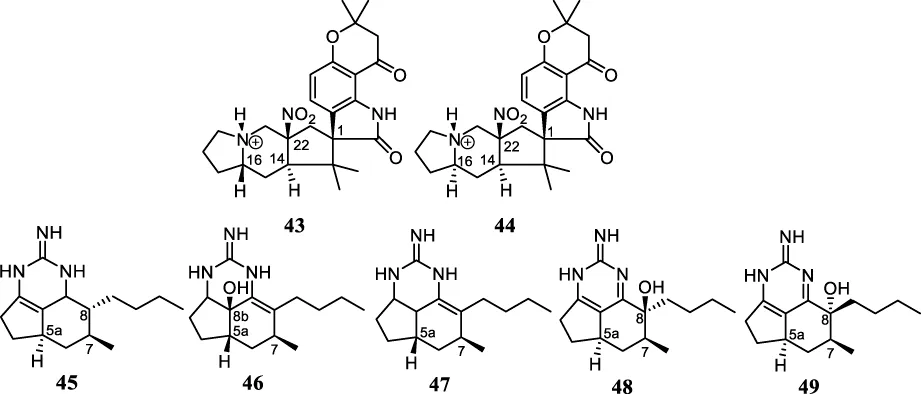Two new alkaloids citrinalins A (43) and B (44) were isolated from the marine Penicillium citrinum, isolated from a seaweed collected in Brazil. The X-ray analysis of 43 enabled the assignment of its AC as 1S,14R,16S,22S. The AC of 44 was suggested as 1S,14R,16R,22S since both alkaloids presented similar OR values with the same signal (Pimenta et al., 2010). The guanidine alkaloids (5aR,7S,8R)-mirabilin B (45), (5aS,7S,8bS)-8bβ-hydroxyptilocaulin (46), (5aS,7S)-ptilocaulin (47), (5aR,7S,8S)-8β-hydroxymirabilin B (48), (5aR,7S,8R)-8α-hydroxymirabilin B (49), isolated from the sponge Monanchora arbuscula, had their AC indicated however there is no mention of how these configuration were assigned (Ferreira et al., 2011).