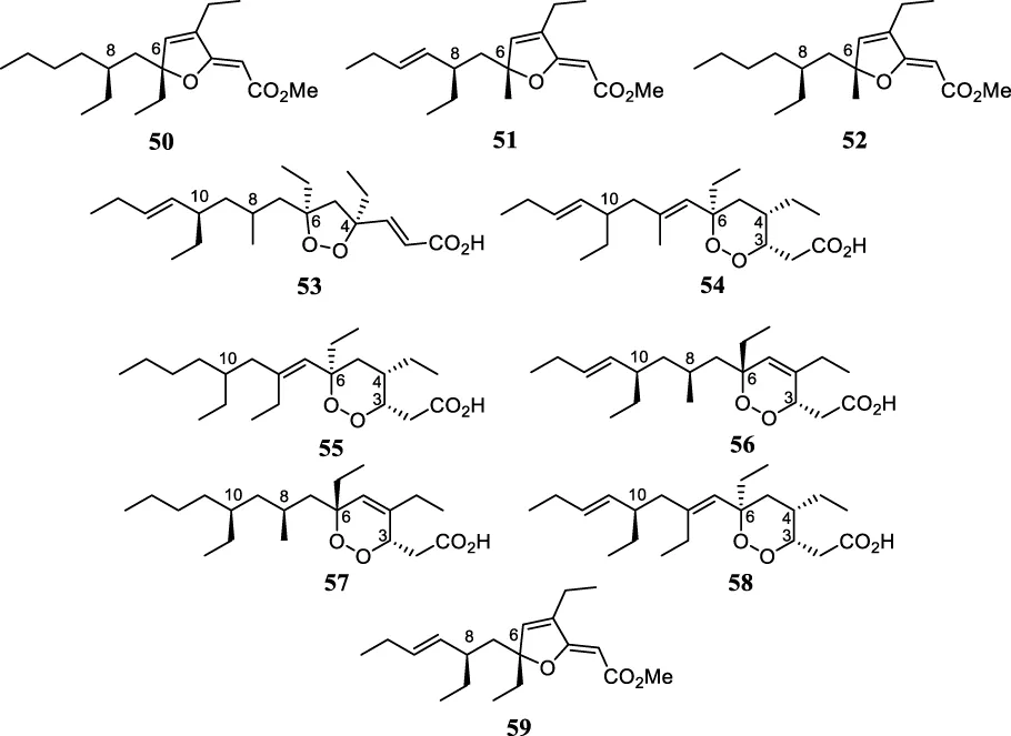 Peroxide and peroxide-derived polyketide are metabolites commonly isolated from marine sponges (Norris and Perkins, 2016). Three peroxide-derived polyketides, the plakilactones 6-desmethyl-6-ethyl-9,10-dihydrospongosoritin A (50), spongosoritin A (51), and 9,10-dihydrospongosoritin A (52), were isolated from the Brazilian sponge Plakortis angulospiculatus. The AC of these compounds was deduced based on their negative OR values and comparison with literature data (Epifanio et al., 2005; Santos et al., 2015). The ACs of the plakortides (+)-7,8-dihydroplakortide E (53), (−)-54, (−)-55, (−)-56, (−)-57, and (−)-plakortide P (58), and of the plakilactone (−)-6-desmethyl-6-ethyl-spongosoritin A (59), isolated from the same species, were also assigned based on similarities between OR values with those of structurally related compounds (Santos et al., 2015). The ACs of spongosoritin A (51) and 9,10-dihydrospongosoritin A (52) were confirmed to be (−)-(6R,8R) and (−)-(6R,8S), respectively, using VCD, ECD, NMR and OR, all associated with quantum chemical calculations (Batista et al., 2019).