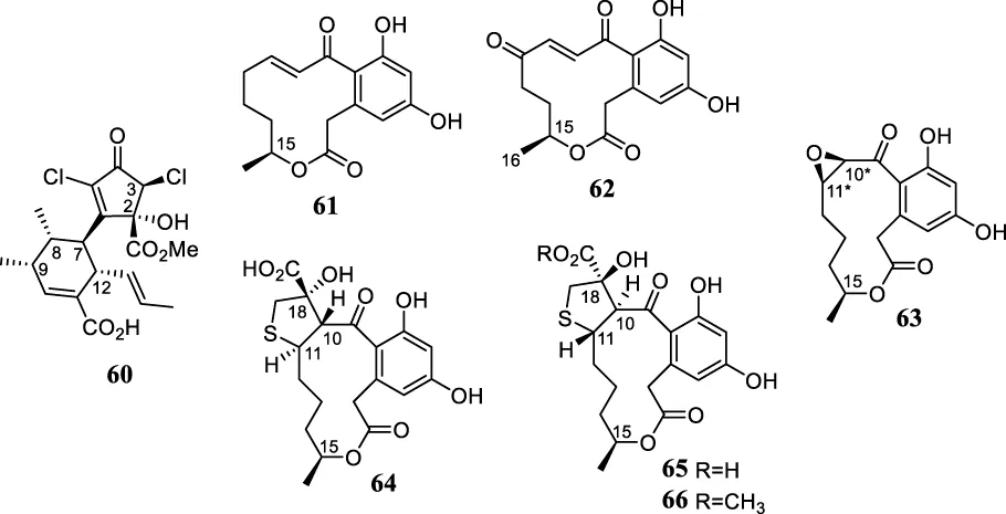The dichlorinated polyketide roussoellatide (60), isolated from the marine-derived fungus Roussoella sp. DLM33, had its AC established by X-ray diffraction analyses as 2S,3S,7R,8S,9R,12S (Ferreira et al., 2015). Finally, the structures and ACs of six macrocyclic curvularin-related polyketides, isolated from a marine-derived Penicillium sp. DRF2, were established by spectroscopic data and X-ray diffraction analysis as (15S)-10,11-dehydrocurvularin (61), (15S)-12-keto-10,11-dehydrocurvularin (62), (15S)-cis-10,11-epoxycurvularin (63), (10R,11R,15S,18S)-cyclothiocurvularin A (64), (10S,11S,15S,18R)-cyclothiocurvularin B (65), and (10S,11S,15S,18R)-cyclothiocurvularin B methyl ester (66) (Castro et al., 2016).