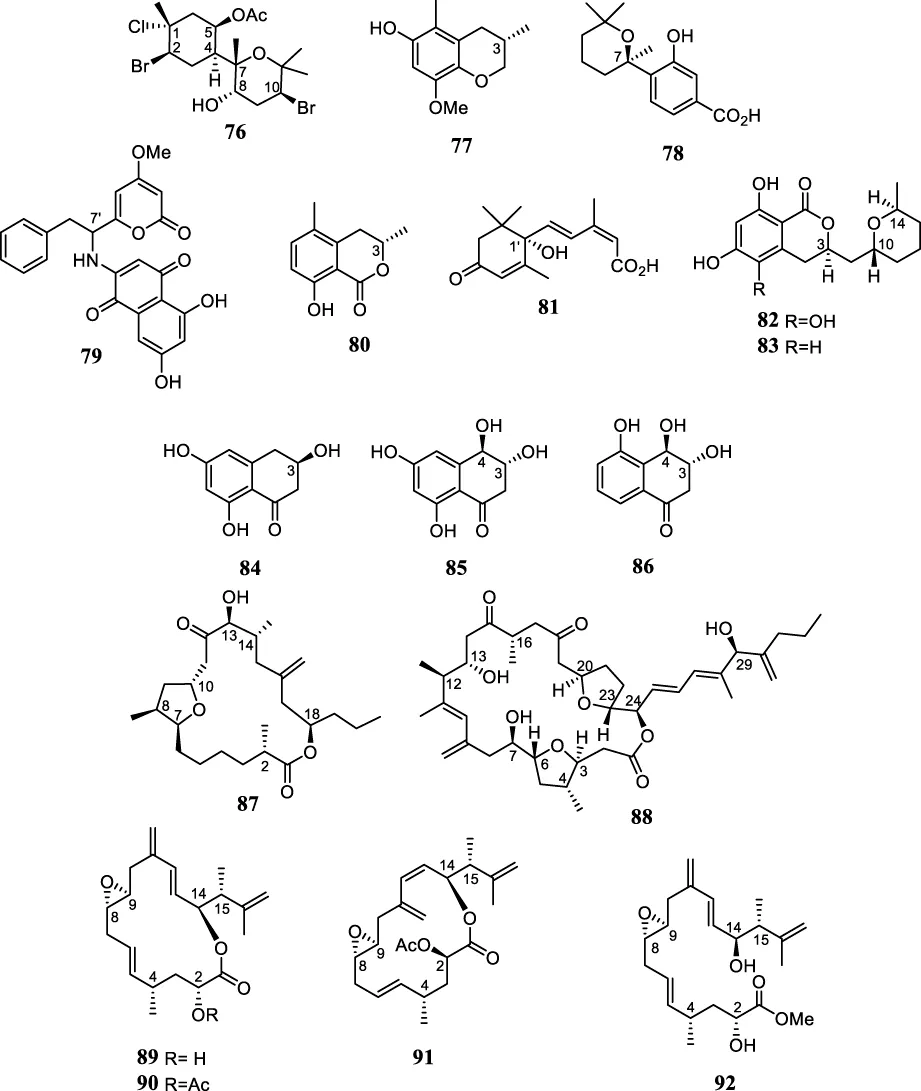 The halogenated metabolite (+)-5-acetoxycaespitol (76) was isolated from the Brazilian red alga Laurencia catarinensis and its AC was assigned using the modified Mosher’s method as depicted (Lhullier et al., 2010). The structure and AC of 8-methoxy-3,5-dimethylisochroman-6-ol (77), isolated from Penicillium steckii obtained from a Brazilian alga of the genus Sargassum, was established by NMR analysis and by comparison of its OR value with those reported in the literature as S (Kossuga et al., 2012). Four compounds (78-81) were isolated from marine-derived fungal strains obtained from Brazilian marine invertebrates and had their ACs established by comparison of their OR values with literature data (Ióca et al., 2016). Chemical investigation of the deep-sea fungus Penicillium coralligerum YK-247 led to the isolation of the new compound (−)-cladomarine (82) and the known (−)-cladosporin (83). The ACs of these compounds were determined to be 3R,10R, 14S by comparison of the OR values and ECD analysis (Takahashi et al., 2017). The compounds (3R)-scytalon (84), (3R,4R)-4-hydroxy-scytalone (85), and (3R,4R)-3,4,5-trihydroxy-1-tetralone (86) were isolated from endophytic fungi isolated from red alga Asparagopsis taxiformis and had their ACs established by ECD spectroscopy (Medina et al., 2018). The amphidinolides named amphidinolide T1 (87), C4 (88), PX1 (89), PX2 (90), PX3 (91), and stragulin A (92) were isolated from the Brazilian octocoral Stragulum bicolor (Nuzzo et al., 2016; Nuzzo et al., 2019). The AC of 87 was assigned by comparison of OR value with those reported in the literature for the same compound while the ACs of 88 and 92 were suggested based on similarities with analog compounds and modified Mosher’s analysis (Nuzzo et al., 2016; Nuzzo et al., 2019). Since compounds 89-91 share the same carbon skeleton of the stragulin A (92), the same AC of 92 was suggested for these related compounds (Nuzzo et al., 2019).