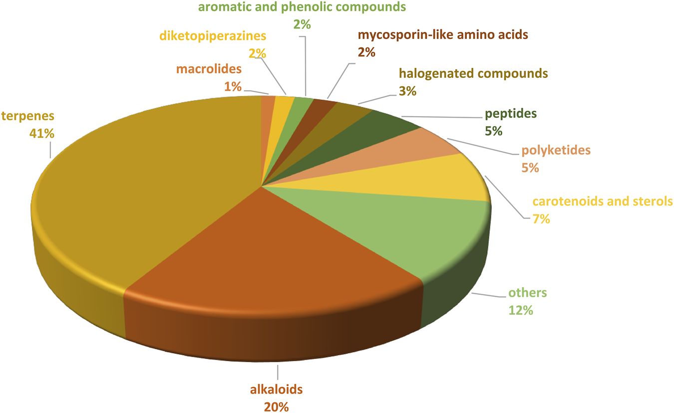 About 4,000 articles were found. After eliminating duplicates, the articles were individually analyzed and only those that described extracts or natural products obtained from organisms collected on the Brazilian coast were selected (more than 400). Approximately 58% of these articles reported isolation of secondary metabolites, 22% of primary metabolites and 20% of crude extracts. A more detailed analysis was carried out considering the marine organism and the classes of metabolites studied (Figure 1). Regarding the types of marine organisms evaluated, the majority were algae and seaweeds, followed by sponges and corals. It was also found articles reporting studies on fungi and bacteria, as well as bryozoans and crustaceans among others. In relation to the classes of metabolites analyzed (Figure 2), the most common were terpenes (41%), followed by alkaloids (20%), carotenoids and sterols (7%), polyketides (5%), peptides (5%) among others.