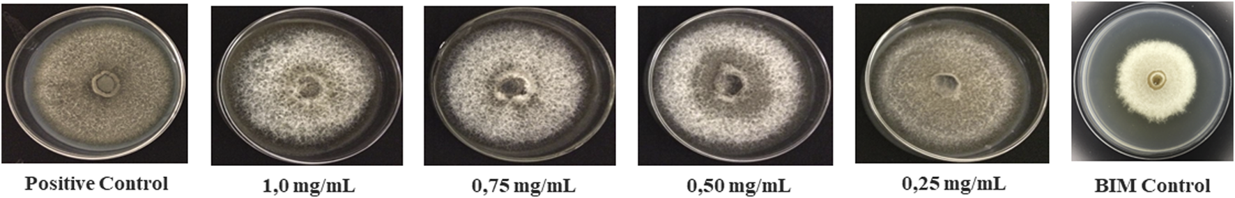 Inhibition in the growth of the colony of M. oryzae was observed in the presence of both B. laevifolia extracts, noting that the mycelial diameter of the colony was reduced with the increase in extract concentration. Treatments of 1.0 mg/mL of EEL and EEF presented the greatest level of inhibition by 21.72% and 30.49%, respectively (Table 2).