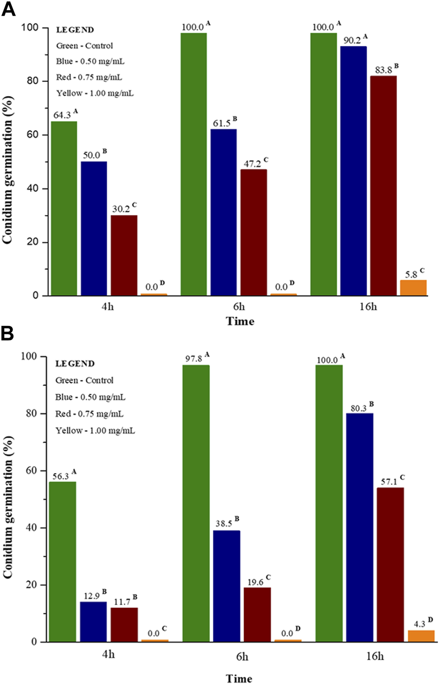 (A) Germinated conidia of Magnaporthe oryzae in the presence of ethanolic extract of leaves from Banisteripsis. laevifolia; (B) Germinated conidia of M. oryzae in the presence of ethanolic extract of flowers from B. laevifolia. Means followed by the same letters do not differ according to the Tukey test (p < 0.05).