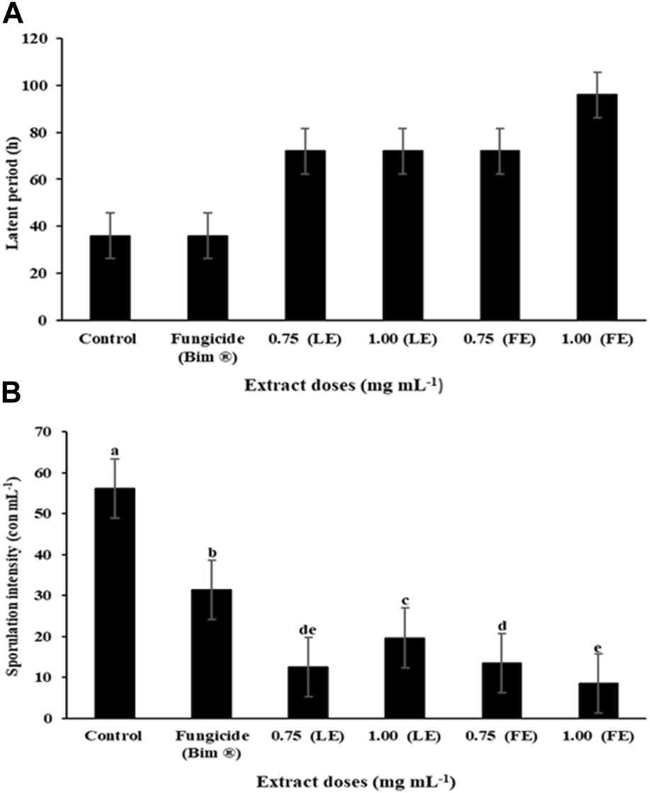 (A) Latent period (LP) and (B) sporulation intensity (SI) of the pathogen submitted to different treatments (T1 - Control, T2 - Fungicide (Bim ® 750 g/kg Tricyclazole – 250 g/L.1/ha + M. oryzae suspension, T3 – 0.75 mg/mL of leaf extract + M. oryzae suspension, T4 – 1.00 mg/mL of leaf extract + M. oryzae suspension, T5 – 0.75 mg/mL of flower extract + M. oryzae suspension, T6 – 1.00 mg/mL of flower extract + M. oryzae suspension).