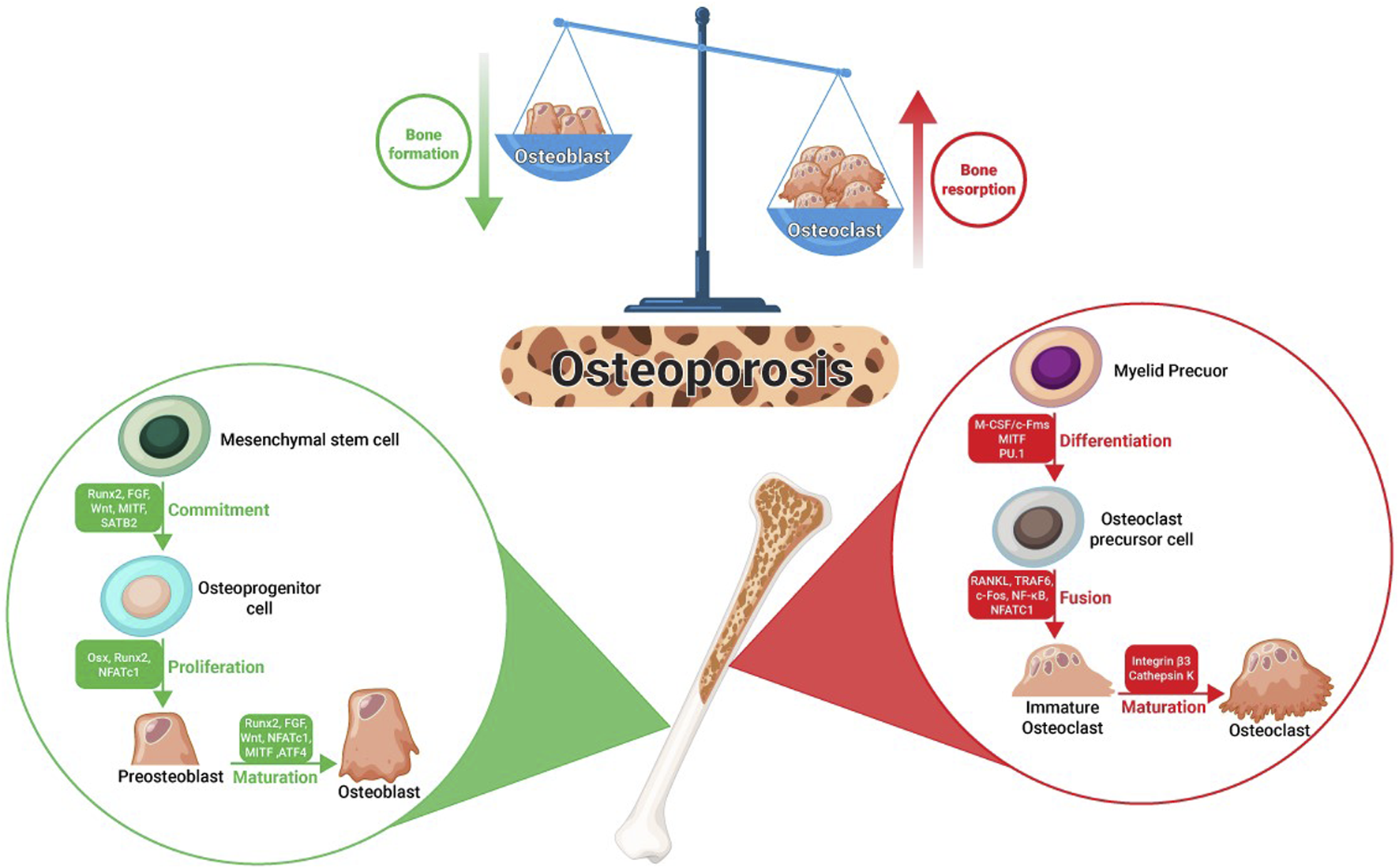 The equilibrium between bone resorption, carried out by osteoclasts, and the formation of bone matrix, facilitated by osteoblasts, is meticulously regulated through a series of intricate and tightly controlled processes. These processes are crucial in maintaining mineral homeostasis and preserving bone mass (Kim et al., 2020). The imbalance between the formation and resorption of bones causes osteoporosis (Lei et al., 2023). Multiple transcription factors, including runt-related transcription factor 2 (Runx2) and osterix (Osx), along with essential developmental signals such as the Wingless-INT (WNT) signals, are recognized for their role in regulating osteoblast differentiation and function (Long, 2011). The differentiation and activity of osteoclasts are regulated by many factors, including cytokines, αVβ3 integrins, macrophage colony-stimulating factor (M-CSF), receptor activator of nuclear factor-κΒ ligand (RANKL), and its receptor RANK (Matsumoto and Endo, 2021; Song et al., 2022). A schema summarizing the cellular biology of osteoporosis is illustrated in Figure 1.