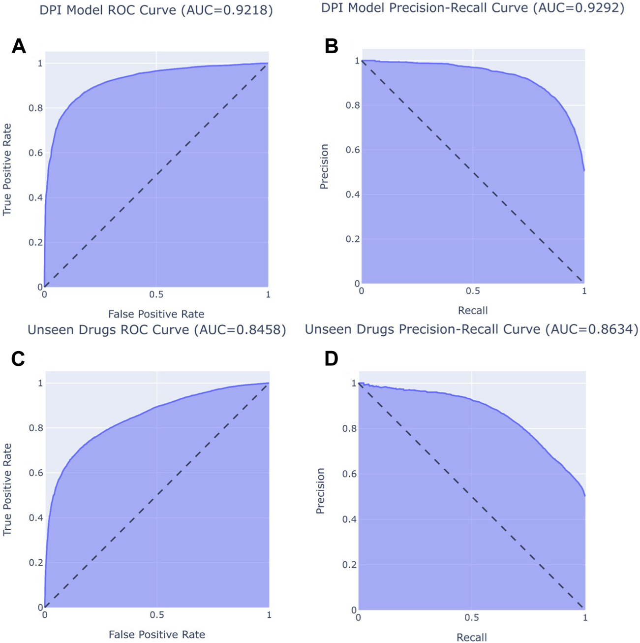 On the unseen drugs, DeepDPI achieved an accuracy of 0.77, an AUROC of 0.85, and an AUPRC of 0.86 (Figure 1). Additionally, the model achieved a high precision of 0.84 and also a high specificity of 0.87. Although there is a dropoff in performance, the model still performs well for unseen drugs and seen proteins.