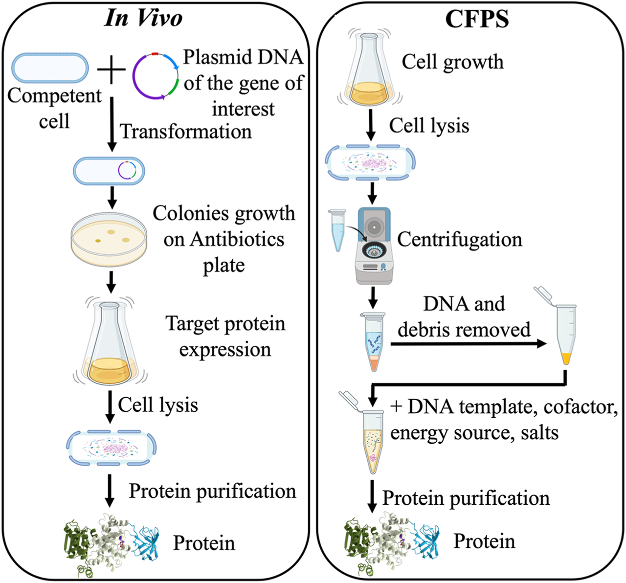Comparison of in vivo recombinant DNA protein expression and cell-free protein synthesis (CFPS) methods.