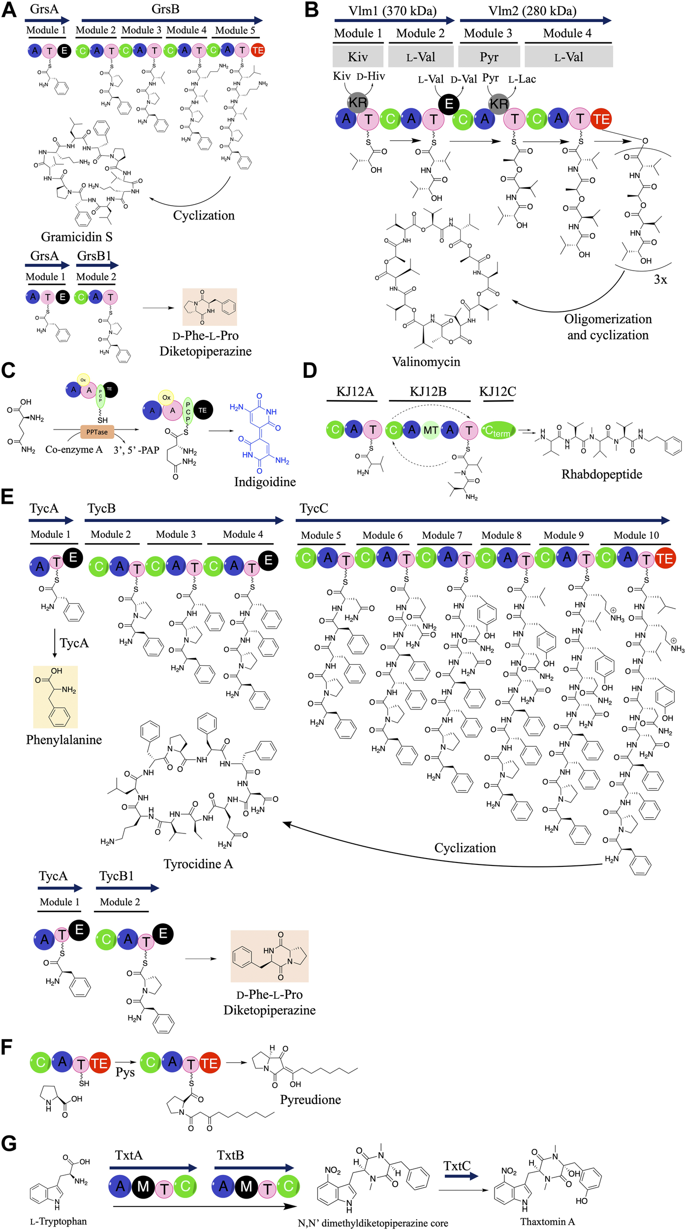 Biosynthesis of non-ribosomal peptide metabolites expressed in CFE systems. (A) Gramicidin NRPS. (B) Valinomycin NRPS. (C) Blue Pigment Synthetase A (BpsA). (D) Rhabdopeptides NRPS. (E) Tyrocidine A NRPS. (F) Pyreudione NRPS. (G) Thxatomin A NRPS.
