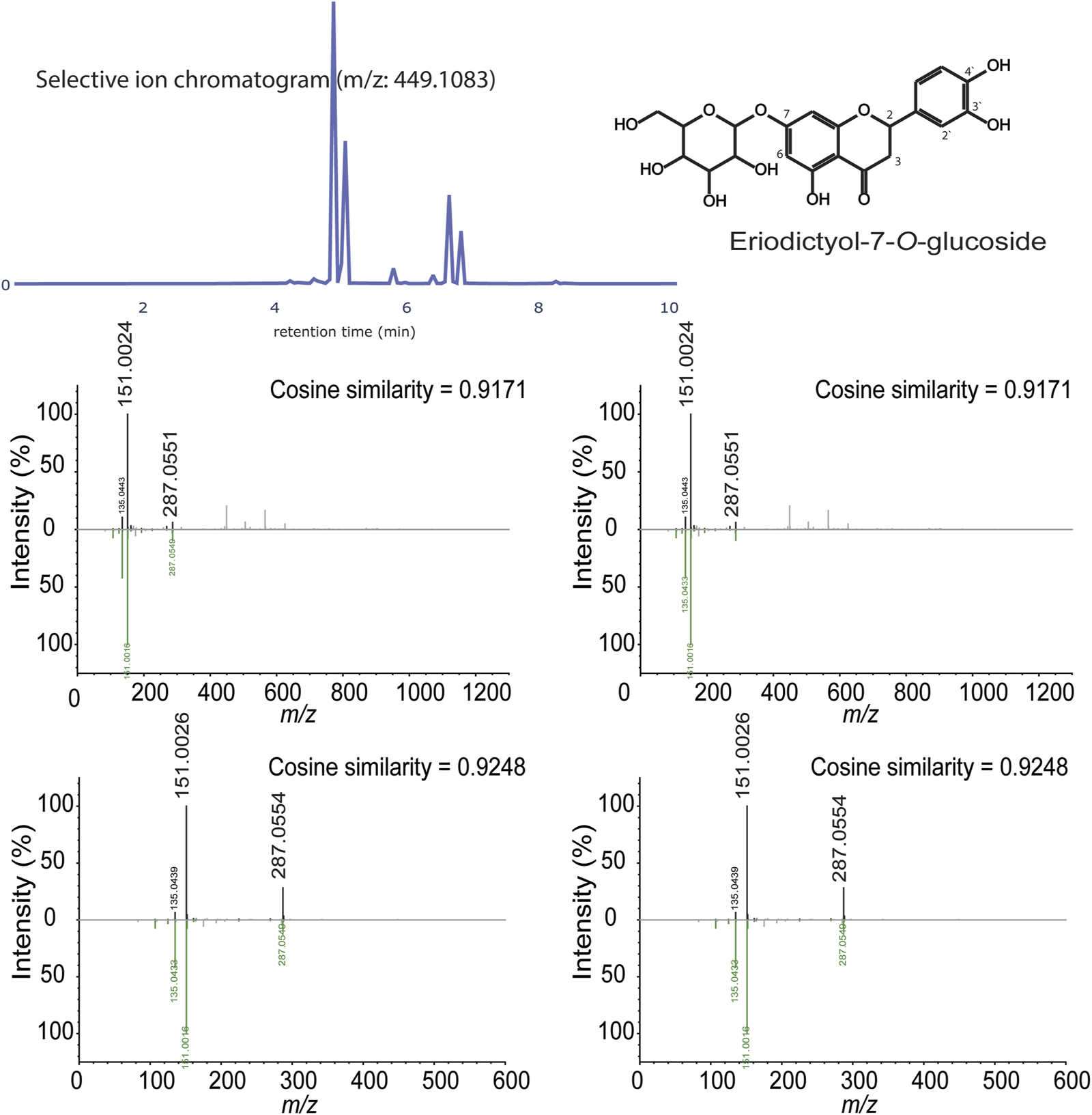 FIGURE 1. Example of isomers detected from a dataset (data not published) showing the MS fragmentogram of the precursor ion at m/z 449.1090 with the same diagnostic fragments at m/z 151.0027 and 287.0573. These are doubtless four different compounds that show the same MS fragmentogram and this is why it is impossible to assert the identity of each compound beyond reasonable doubt. Library matching provided the same annotation for all these four features.