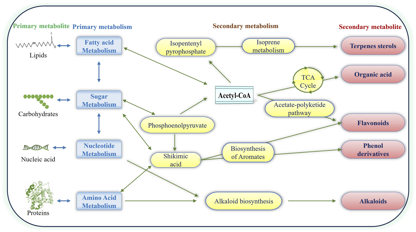 Illustration of Plant Natural Products: primary and secondary metabolites. Pathways from primary metabolites contribute to the production of terpenes, flavonoids, phenolics, alkaloids and organic acids, forming distinctive major classes of secondary metabolites.