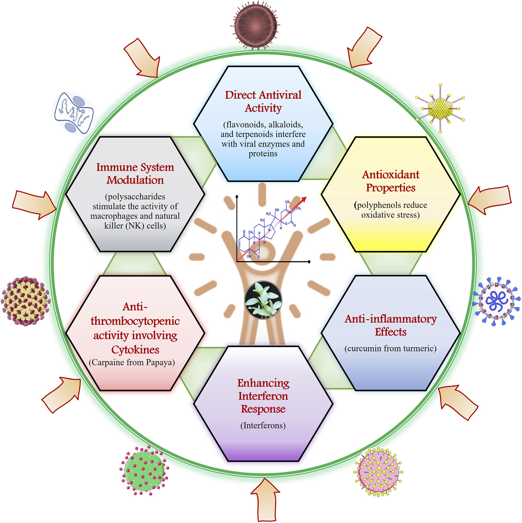 The image illustrates various mechanisms by which natural products contribute to antiviral activity and enhance immune function in the human.