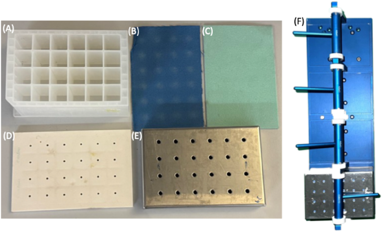 Applikon Biotechnology® micro-bioreactor cultivation system, (A) 24-well plate, (B) extruded Teflon (0.2 μm), (C) microfiber, (D) soft silicone layers, (E) perforated stainless steel cover, and (F) plate holder.