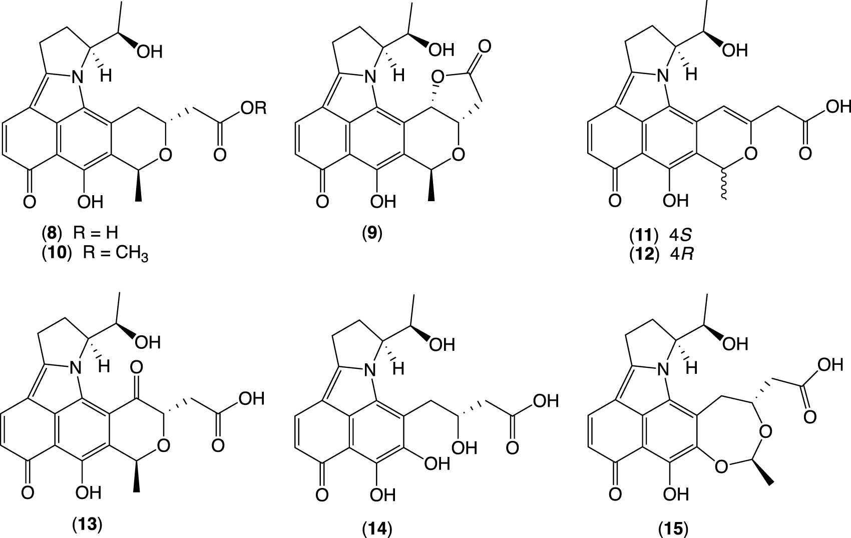 This study describes a chemical investigation into the secondary metabolites of Streptomyces sp. CMB-PB042, isolated from Australian sheep station pasture plant. This led to the discovery of the rare enamine naphthopyranoquinones BE-54238 A (8) and BE-54238B (9), together with four new analogs, glenthenamines B–D (11–13) and F (15), and two handling artifacts, glenthenamines A (10) and E (14) (Figure 4) (Wu et al., 2022). In this study, we employed a media MATRIX cultivation approach to find the best media for the production of new metabolites from CMB-PB042.