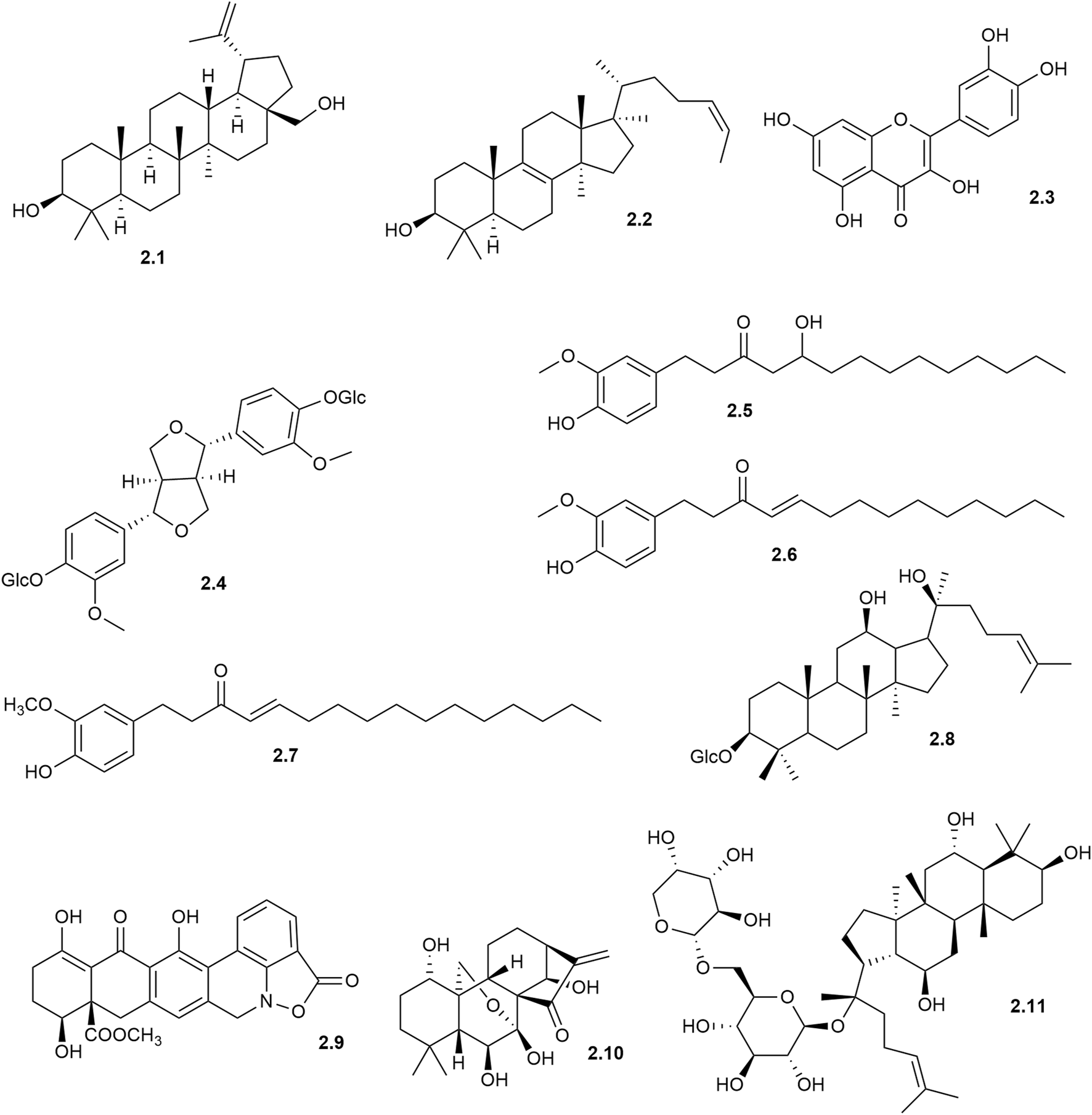 Ultrafiltration AS-MS was applied to explore 5-lipoxygenase (5-LOX) ligands in Inonotus obliquus, leading to the identification of three promising molecules: botulin (2.1), lanosterol (2.2), and quercetin (2.3) (Yun et al., 2024) (Figure 2). These potential inhibitors were identified based on their binding affinity with 5-LOX, a result further validated by molecular docking, which detailed their interactions with the enzyme’s active site. Complementary methods, including semi-preparative liquid chromatography and high-speed countercurrent chromatography, were then applied to isolate these molecules with high purity allowing complete chemical characterization. This study demonstrates how ultrafiltration AS-MS can speed up the identification of active molecules from complex natural mixtures, improving efficiency in bioactive molecules research.