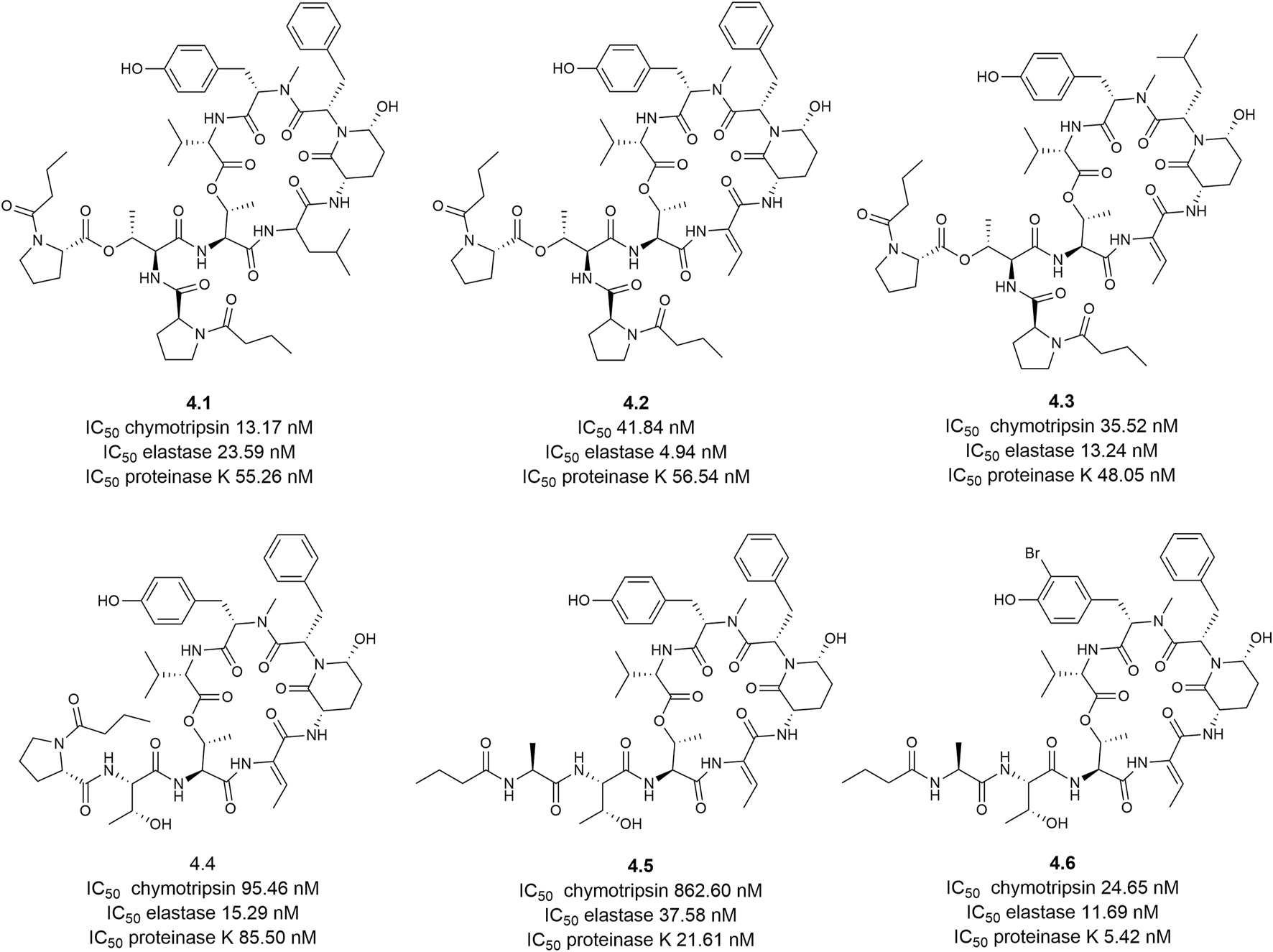Structures and potency of the isolated rivulariapeptolides and molassamides from an environmental cyanobacteria community for three serine proteases.