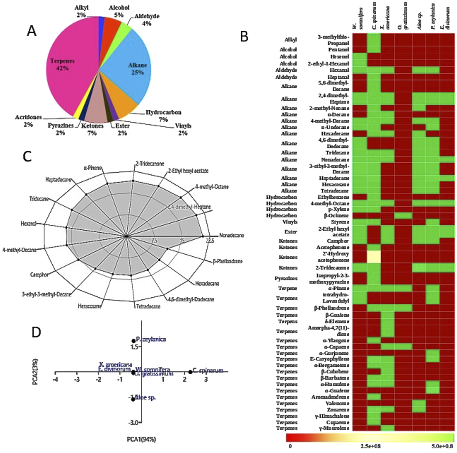 (A) Pie chart showing distribution of metabolites by class. Most compounds were alkanes and terpenes (B) Heat map showing distribution of metabolites across most commonly prescribed plants (C) Radar plots indicating most abundant and important compounds as projected by MDA (D) PCA plots of plants based on their VOCs. Plots were generated using the first two components (PC1 and PC2), PC1 explained 94% of the total variance while PC2 explained 3%.