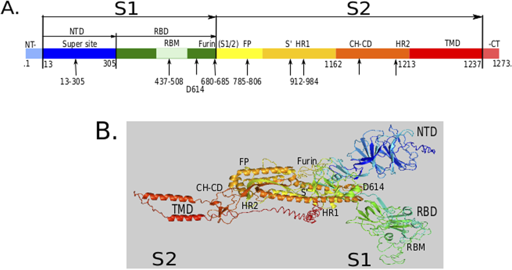 Spike protein 3-D model of key domains. (A) A schematic linear organization of the domains along a S-protein sequence of 1273 amino acids indicating the two major domains S1 and S2 with estimated amino acid positions of the various sub-domains. The S1 comprises signal peptide (SP) in the first 13 amino acids, the super site mutable N-terminal domain (NTD), and receptor binding domain (RBD). (B) The 3-D model of the S-protein with the domains mapped at their approximate regions: S1 comprising NTD, RBD and a region near the D614 mutable site; S2 comprising Furin catalytic site (S1/2 cleavage), fusion peptide (FP) with a second cleavage site S′, heptad repeat (HR) regions HR1 and HR2, the central helix (CH) and connector domains (CD), and the transmembrane domain (TMD). The arrows indicate approximate range of residues for the domains. The full length SARS-CoV-2 1273 amino acid sequence for the S-protein was downloaded from the NCBI (https://www.ncbi.nlm.nih.gov/protein/YP_009724390.1) and the 3-D structure modeled using I-TASSER tool. The model image was annotated using Inkscape version 1.3.2 (https://inkscape.org).