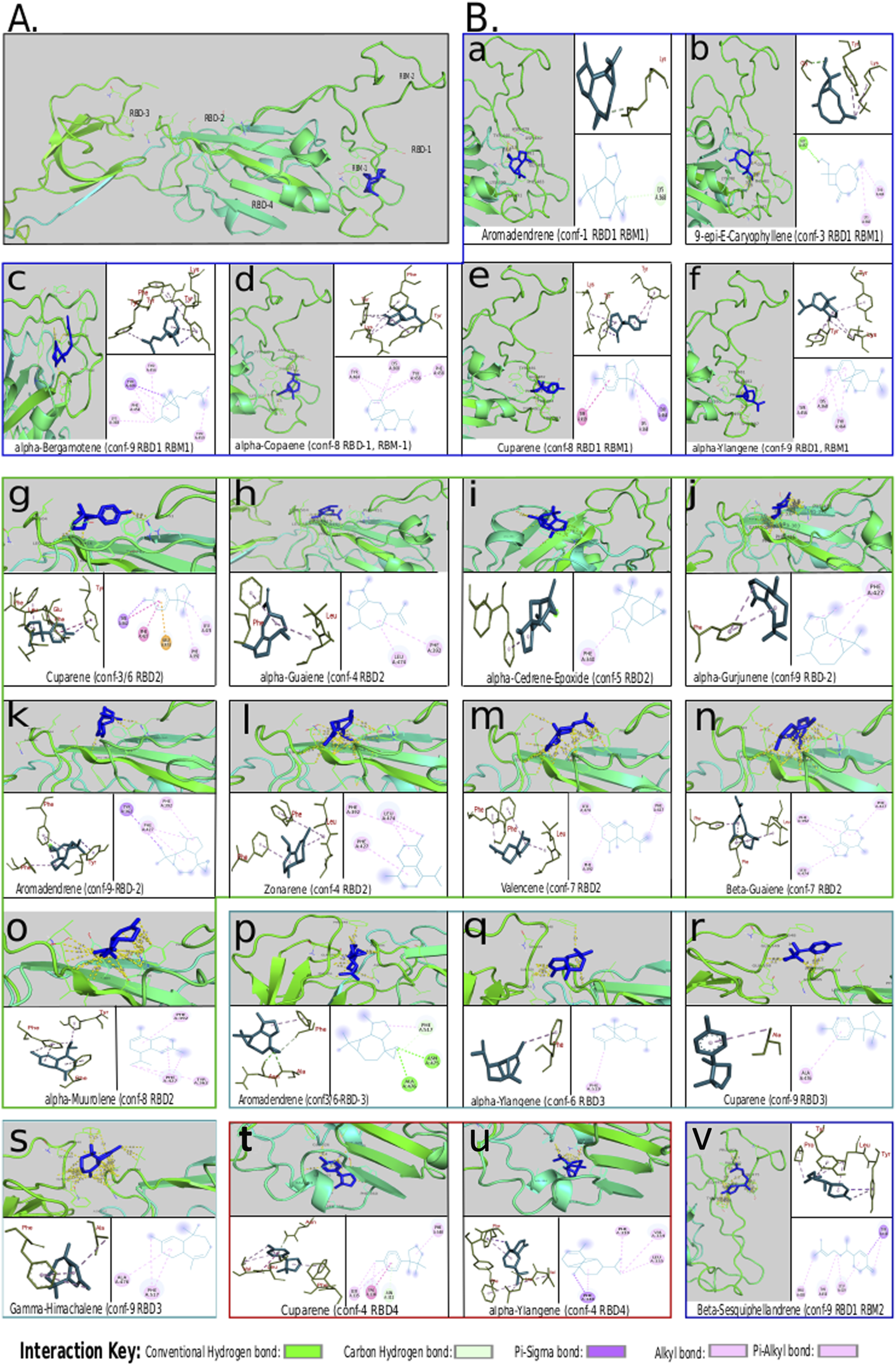 Phytochemicals interacting with SARS-CoV-2 S1 RBD. (A) The S-protein S1 RBD ligand binding sites: RBD1 (RBM1 and RBM2, the native binding sites for ACE-2), RBD2, RBD3, and RBD4. (B) The leading binding phytochemicals (ligands in blue color) onto the S1 RBD binding sites: (a–f) RBD1 RBM1 and (v) RBD1 RBM2 (blue outline) with the best binders as Aromadendrene, 9-epi-E-Caryophyllene, alpha-Bergamotene, alpha-Copaene, Cuparene, and alpha-Ylangene, the best ligand is beta-Sesquiphellandrene; (g–o) ligands onto RBD2 (green outline) are Cuparene, alpha-Guaiene, alpha-Cedrene-Epoxide, alpha-Gurjunene, Aromadendrene, Zonarene, Valencene, alpha-Muurolene, beta-Guaiene; (p–s) ligands onto RBD3 (cyan outline) include Aromadendrene, Cuparene, gamma-Himachalene, and alpha-Ylangene; and (t,u) ligands to RBD4 (red outline) are Cuparene and alpha-Ylangene. The amino acid interactions were modeled using AutoVina and visualized using PyMol program (Shrödinger and DeLano, 2020). The Interacting amino acid atoms were analyzed using Biovia Discovery Studio Visualizer.