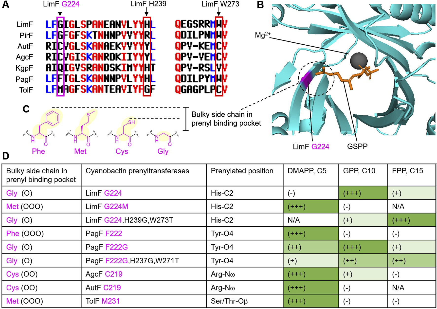 (A) Sequence alignment of representative cyanobactin prenyltransferases, highlighting the active sites correlated to G224, H239 and W273 in LimF. (B) Complex structure of LimF-GSPP (PDB:7VMW), showing the space occupied by G224 in the prenyl binding pocket. (C) Bulky side chain residues that affect pocket sizes are colored in purple. (D) Prenylation activities. High, moderate, and low prenylation activities are indicated as (+++), (++) and (+), respectively. No reactions and not tested are indicated as (−) and N/A, respectively. Large, moderate, and small bulky side chains are indicated as (OOO), (OO) and (O), respectively.