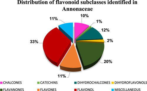 Figure 2. The graph shows the relative proportion of flavonoid subclasses reported in species of the Annonaceae family, including chalcones, dihydrochalcones, flavanones, flavonols, flavones, catechins, dihydroflavonols, and other miscellaneous compounds.