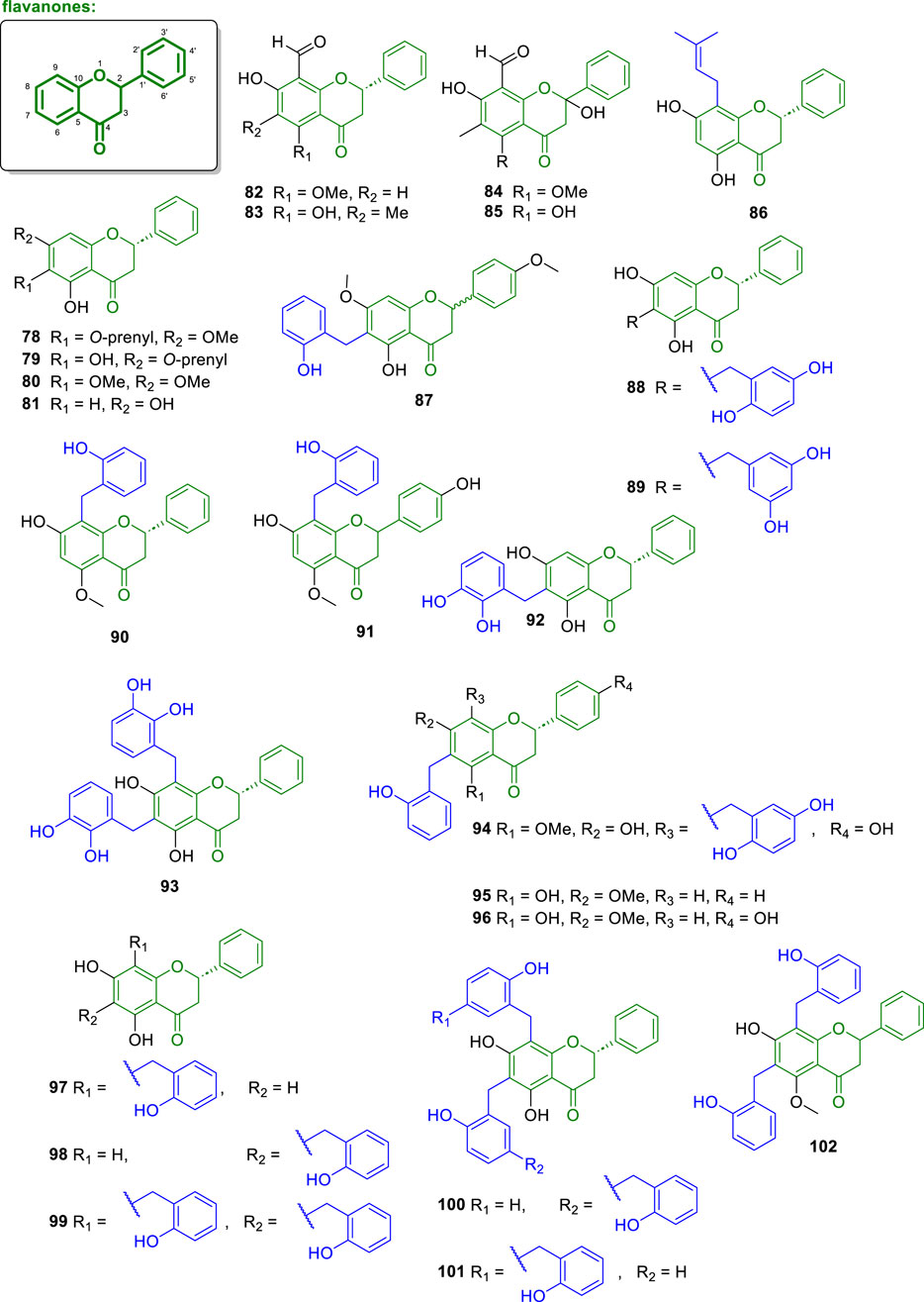 Concerning flavanones, 48 structures (Figures 6, 7) were isolated from a wide range of plant species belonging predominantly to the Annonaceae family, including genera such as Melodorum, Uvaria, Desmos, Fissistigma, and Friesodielsia. These compounds were obtained from various plant parts, including leaves, roots, stems, bark, twigs, and heartwood, mainly collected across Southeast Asia and West Africa. The isolated flavanones exhibit significant structural diversity, including diverse methoxy and hydroxy substitution patterns, formyl groups, and rare prenylated and C-benzylated derivatives. Several of these flavanones have been reported to exhibit potent biological activities, including antioxidant, cytotoxic, antiplasmodial, estrogenic, aromatase inhibitory, and α-glucosidase inhibitory properties. In particular, compounds featuring 2-hydroxybenzyl moieties, O-prenylation, and unusual dimeric or polybenzylated architectures stand out for their unique structures and promising bioactivity profiles. The following sections present these compounds in detail, highlighting their natural sources, structural characteristics, and biological evaluations.