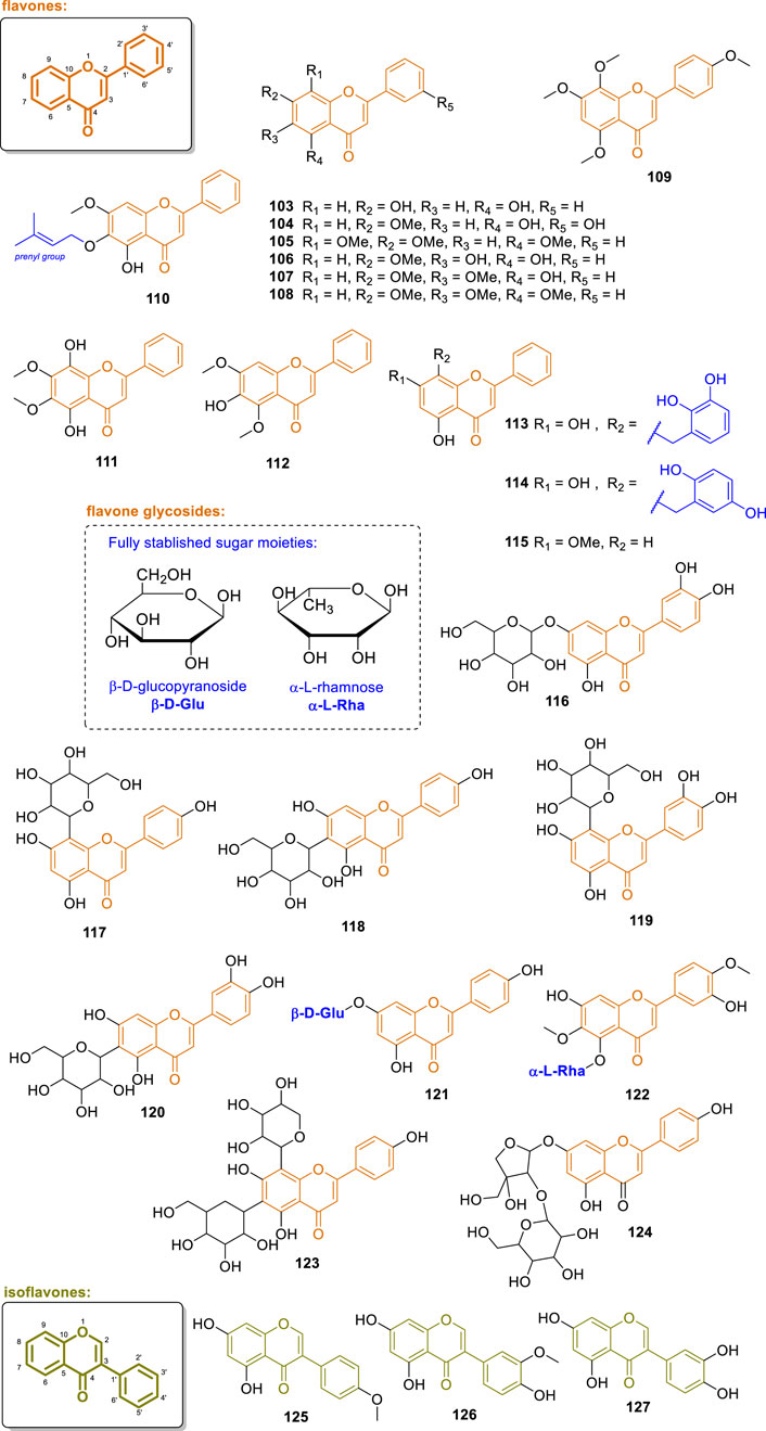 The compound 5,3′-dihydroxy-7-methoxyflavone (104) was isolated from the leaves of Friesodielsia discolor (Prawat et al., 2012). Compound 104 exhibited cytotoxic activity against the MCF-7 cell line, with an IC50 value of 3.45 μg/mL. In the study by Moriyasu et al. (2011), 5,7,8-trimethoxyflavone (105) was isolated from the roots of Uvaria welwitschia (from Kenya). From the leaves of Desmos chinensis collected in Vietnam, negletein (106) was isolated and showed inhibitory activity against NFAT transcription, with an IC50 = 3.89 μM (Kiem et al., 2005). Panichpol and Waterman (1978) isolated the compounds 5-hydroxy-6,7-dimethoxyflavone (107) and baicalein trimethyl ether (108) from the stems of Popowia cauliflora (from Cameroon). Compound 107, also known as isoflavone (Clement et al., 2017), exhibited inhibitory activity on superoxide anion generation with an IC50 value of 1.19 μM (Hsu et al., 2016). Moreover, the molecule tetramethylscutellarein (109) was isolated from the leaves of Cleistochlamys kirkii (from Tanzania) was reported (Nyandoro et al., 2017).
