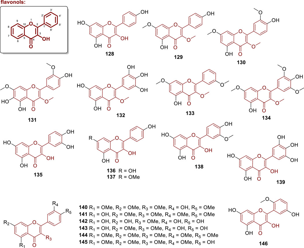 The compound aromadendrin (128) was isolated from the heartwood of Anaxagorea luzonensis (Sabphon et al., 2015). Ngouonpe et al. (2019) isolated the compounds kumatakenin (129) and pachypodol (130) from the stem barks of Duguetia staudtii (from Cameroon). Compounds 129 and 130 exhibited potent urease inhibitory activity, with IC50 values of 17.5 and 14.5 μg/mL, respectively, as well as strong anti-inflammatory activity by inhibiting both the myeloperoxidase-dependent (luminol/zymosan) and -independent (lucigenin/PMA) oxidative burst, with potencies expressed as IC50 ranging from 4.99 to 14.13 μg/mL (Ngouonpe et al., 2019). Additionally, the compounds 5-hydroxy-3,7-dimethoxy-2-(3-methoxyphenyl)-4H-1-benzopyran-4-one (133) and 5,4′-dihydroxy-3,7,3′,5′-tetramethoxyflavone (134) were also isolated by Ngouonpe et al. (2019). Compound 134 exhibited potent urease inhibitory activity (IC50 = 10.9 μg/mL) and strong anti-inflammatory activity by inhibiting both myeloperoxidase-dependent and -independent oxidative burst, with IC50 values ranging from 3.89 to 8.55 μg/mL. Furthermore, from the leaves of Miliusa balansae, the compound chrysosplenol C (131) was described (Thao et al., 2015), while annulatin (132) was isolated from the aerial parts of Goniothalamus gardneri, (from India) (Seidel et al., 2000).