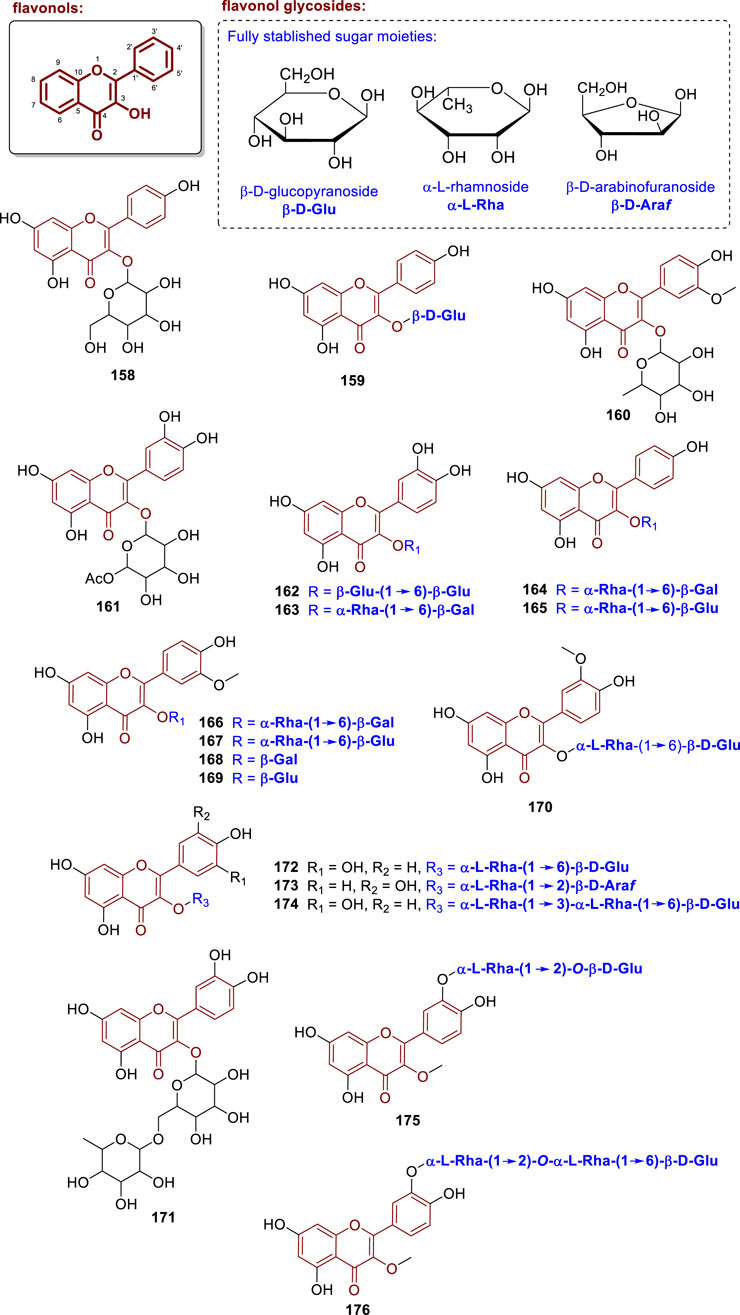 From the leaves of Annona crassiflora (from Brazil), the compounds quercetin-3-O-β-D-galactopyranoside (152) and quercetin-3-O-β-L-arabinopyranoside (153), which exhibited larvicidal activity with LD50 values of 103.74 and 109.52 μg/mL, respectively (Lage et al., 2014). Additionally, quercetin-3-O-arabinofuranoside (154) from the leaves of Xylopia emarginata (from Brazil) (Moreira et al., 2003), quercetin-3-O-β-galactoside (155) and kaempferol-3-O-β-galactoside (158) from the leaves of Annona dioica (from Brazil) (Formagio et al., 2013), tanarixetin-3-O-rhamnoside (156) and kaempferol-3-O-rhamnoside (157) from Annona purpurea (from Taiwan) (Chang et al., 1998) were isolated, but the absolute stereochemistry of the glycosyls not established.