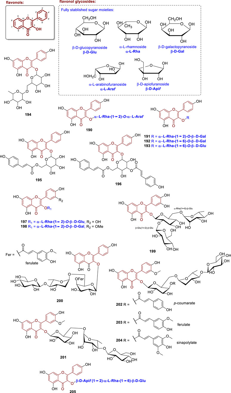 Furthermore, the compound quercetin 3-O-α-rhamnosyl-(1″→6″)-β-sophoroside (199) was isolated from the leaves of Annona muricata (Nawwar et al., 2012). The chemical investigation of the leaves of Fissistigma maclurei collected in Vietnam, yielded the isolation of the compounds kaempferol 3-O-β-D-glucopyranosyl-(1→4)-α-L-rhamnopyranosyl-(1→6)-[4-(E)-feruloyl]-β-D-galactopyranoside (200) and fissmacoside A (201) (Ba et al., 2020). Compound 202 is a triglycosylated flavonol consisting of an isorhamnetin moiety linked at position C-3 to a trisaccharide composed of D-Glu(β1→4α)L-Rha(α1→6β)D-Gal. Finally, the leaves of Melodorum fruticosum were studied by Chan et al. (2013), who isolated the flavonoid kaempferol 3-O-β-D-apiofuranosyl-(1→2)-O-[α-L-rhamnopyranosyl-(1→6)]-β-D-glucopyranoside (205).