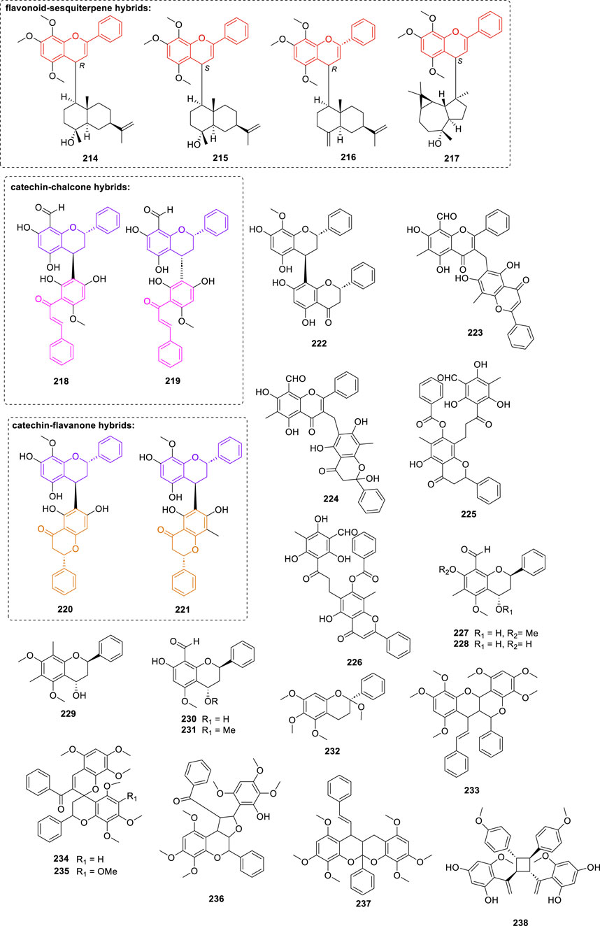The phytochemical study of the leaves and branches of Fissistigma bracteolatum collected in Vietnam, afforded four compounds: fissistigmatins A (214), B (215), C (216), and D (217) (Porzel et al., 2000). Compounds 214–217 are hybrids of flavonoids with sesquiterpenes. The absolute configuration was determined by X-ray crystallography and molecular modeling studies, with congeners A, C, and D assigned as (4R), and fissistigmatin B as (4S). Furthermore, from the leaves of Desmos cochinchinensis (from Thailand) were isolated the compounds desmosflavan A (218) and B (219), characterized as flavan-chalcones dimers (Bajgai et al., 2011). Their absolute configurations were determined by circular dichroism as (2S,4S) for compound 218 and (2S,4R) for compound 219. In the same study, compound 218 exhibited lipoxygenase inhibitory activity with an IC50 of 4.4 µM, whereas compound 219 was inactive. In cytotoxicity assays, compound 218 showed activity against HuCCA-1 (2.25 μg/mL), HepG2 (3.75 μg/mL), A549 (2.45 μg/mL), and MOLT-3 (0.29 μg/mL), while compound 219 exhibited IC50 values of 22.0 μg/mL, 20.3 μg/mL, 27.0 μg/mL, and 1.71 μg/mL against the same cell lines, respectively (Bajgai et al., 2011).