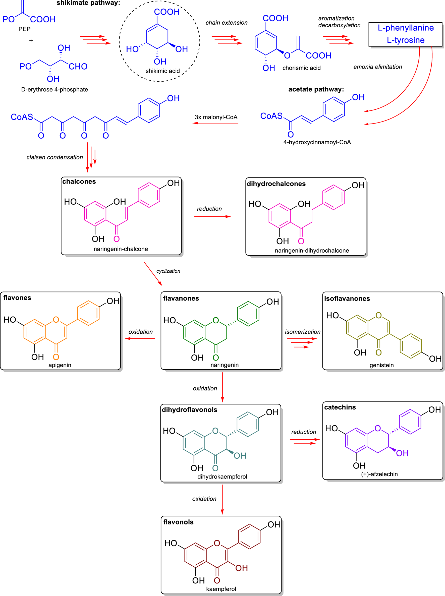 Simultaneously, the acetate pathway produces malonyl-CoA units from acetyl-CoA through the action of acetyl-CoA carboxylase. Three malonyl-CoA units condense with one 4-hydroxycinnamoyl-CoA unit in a reaction catalyzed by chalcone synthase, forming a polyketide intermediate. Through a Claisen-type condensation reaction, the compound naringenin chalcone forms the first intermediate with the basic structure of a flavonoid (Nabavi et al., 2020).