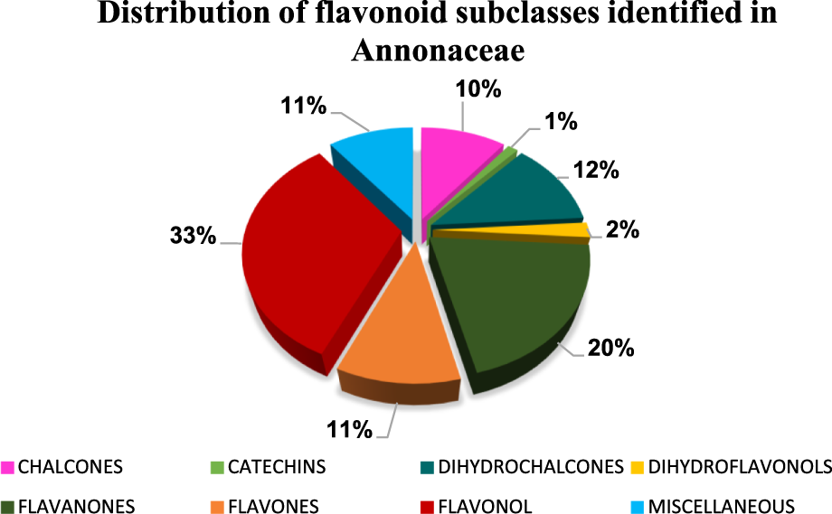 The graph shows the relative proportion of flavonoid subclasses reported in species of the Annonaceae family, including chalcones, dihydrochalcones, flavanones, flavonols, flavones, catechins, dihydroflavonols, and other miscellaneous compounds.