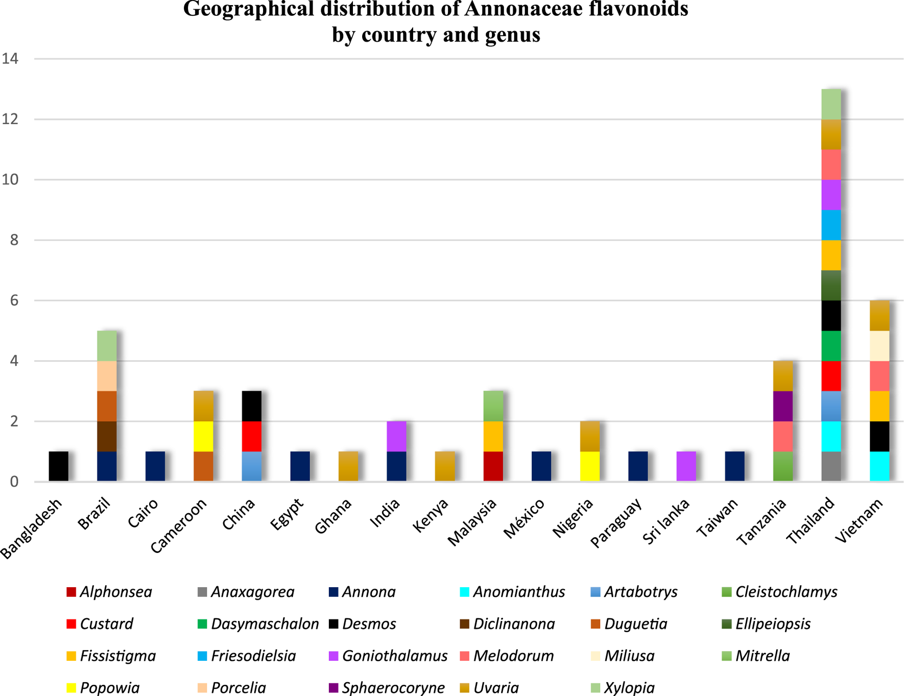 Therefore, Figure 3 shows the geographical distribution of flavonoids isolated from species of the Annonaceae family, as well as the genera associated with each country. There is a clear predominance of studies conducted in Asia, especially in Thailand and Vietnam, which account for the largest number of described compounds and encompass a wide diversity of genera. To a lesser extent, African countries such as Nigeria, Cameroon, and Tanzania also stand out for their contribution of species with phytochemical relevance. The Americas, in turn, show more sporadic records, mainly in Brazil and Mexico. This distribution highlights a strong geographical bias in the investigations, reflecting both the floristic richness of tropical regions and the concentration of active research groups in these areas.