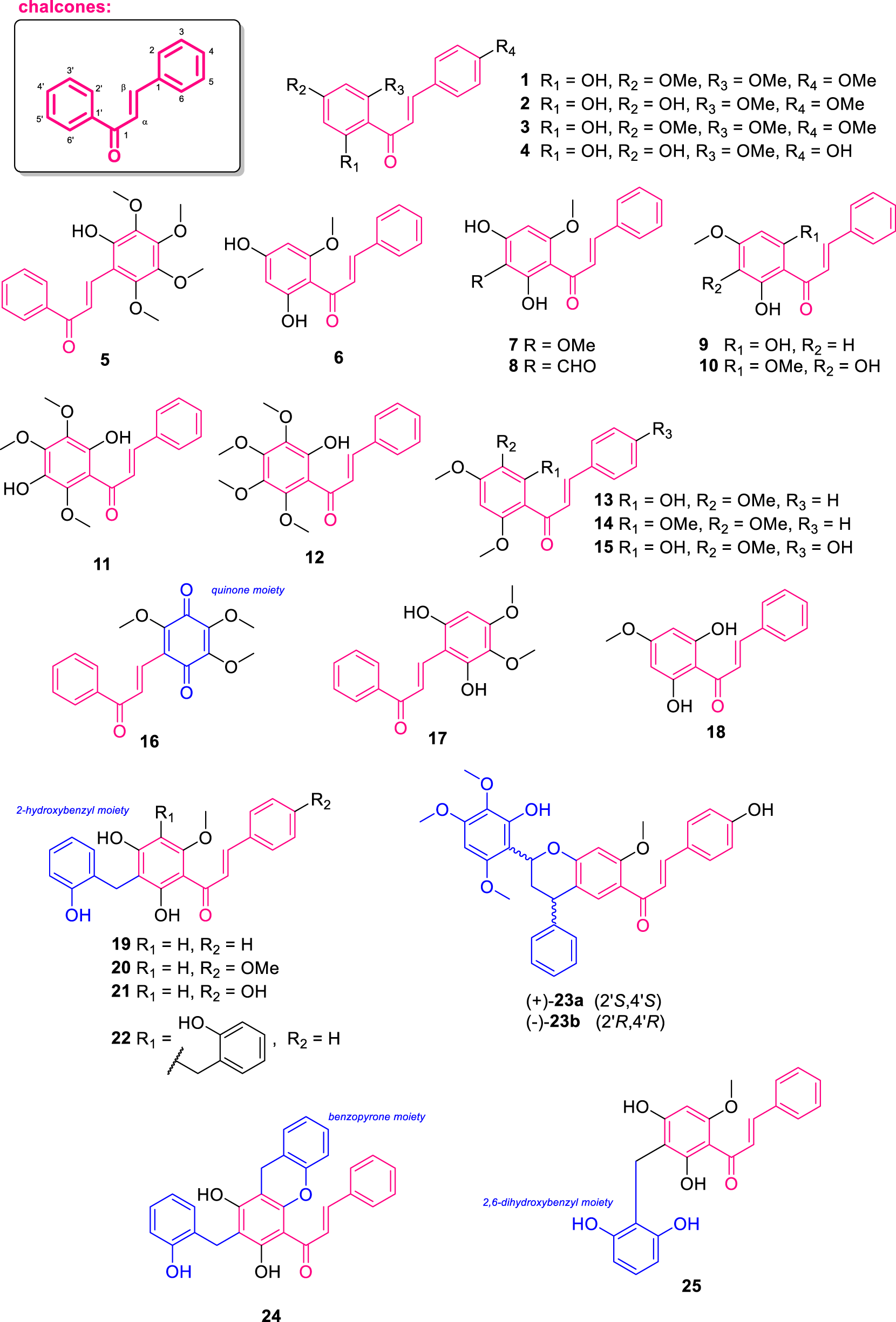 The compound pedicin (11) was isolated from the leaves of Fissistigma lanuginosum (from Malaysia) (Alias et al., 1995), displaying the ring A fully substituted with three methoxy and two hydroxy groups. Besides, kanakugiol (12), isolated from the fruits of Popowia cauliflora, (from Cameroon) differs from 11 by containing four methoxy groups and one hydroxy group at the ring A (Waterman and Pootakahm, 1979). From the same plant, the additional chalcones 2′-hydroxy-3′,4′,6′-trimethoxychalcone (13), 2′,3′,4′,6′-tetramethoxychalcone (14), and 2′,4-dihydroxy-3′,4′,6′-trimethoxychalcone (15) were isolated (Waterman and Pootakahm, 1979). On the other hand, melosiamensone E (16), obtained from the leaves of Melodorum siamensis collected in Thailand, features a quinone core bearing three methoxy groups in ring B (Jaidee et al., 2019). The compound 2-hydroxy-3,4,6-trimethoxychalcone (17), isolated from the roots of Uvaria dependens (Tanzania) (Nkunya et al., 1993b), exhibited cytotoxic activity against human promyelocytic leukemia cells (HL-60) with an IC50 of 22.9 μM (Moriyasu et al. (2011). From leaves of Melodorum fruticosum (from Vietnam), discovered the compound 2′,6′-dihydroxy-4′-methoxychalcone (18), which showed potential anti-inflammatory activity by inhibiting superoxide anions, with an IC50 value of 8.40 μM (Chan et al., 2013).